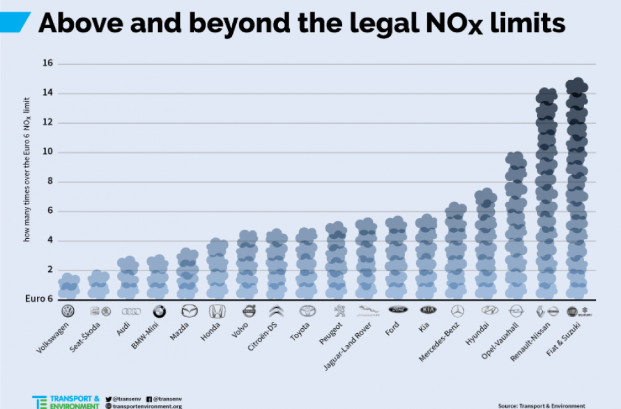 Η ανεξάρτητη οργάνωση Μεταφορών και Περιβάλλοντος κοινοποίησε μια αναφορά που συνέκρινε τις πραγματικές εκπομπές ρύπων ΝΟx (οξειδίων του αζώτου) έναντι αυτών που ανακοίνωναν οι εταιρείες για τα αυτοκίνητα ντίζελ προδιαγραφών Euro 6. Τα αποτελέσματα της έρευνας μας άφησαν όλους ελαφρώς έκπληκτους, καθώς η Volkswagen φαίνεται ότι διαθέτει το πιο καθαρά ντίζελ Euro 6 στην Ευρώπη. Αλλά ακόμη κι αν εκπέμπουν τα χαμηλότερα NOx σε μέσο όρο στα 230 μοντέλα ντίζελ που μετρήθηκαν, οι κινητήρες της Volkswagen εκπέμπουν στον πραγματικό κόσμο τη διπλάσια ποσότητα από αυτή που επιτρέπει το πρότυπο Euro 6.