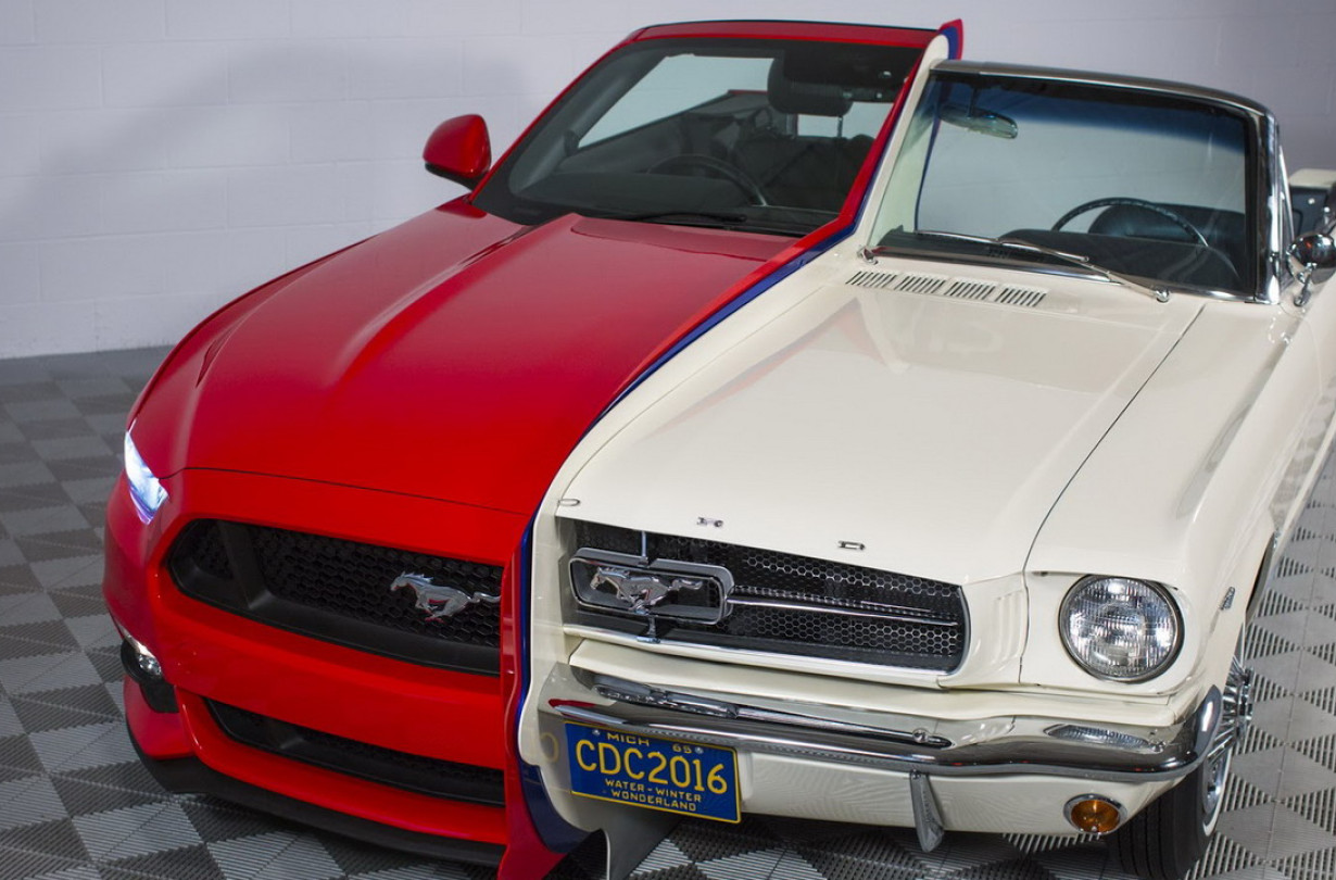 Ποιος είναι ο καλύτερος τρόπος για να συγκρίνεις την πρώτη Mustang του 1965 με την τελευταία, του 2015; Τις κόβεις στη μέση και ενώνεις τα δύο μισά!