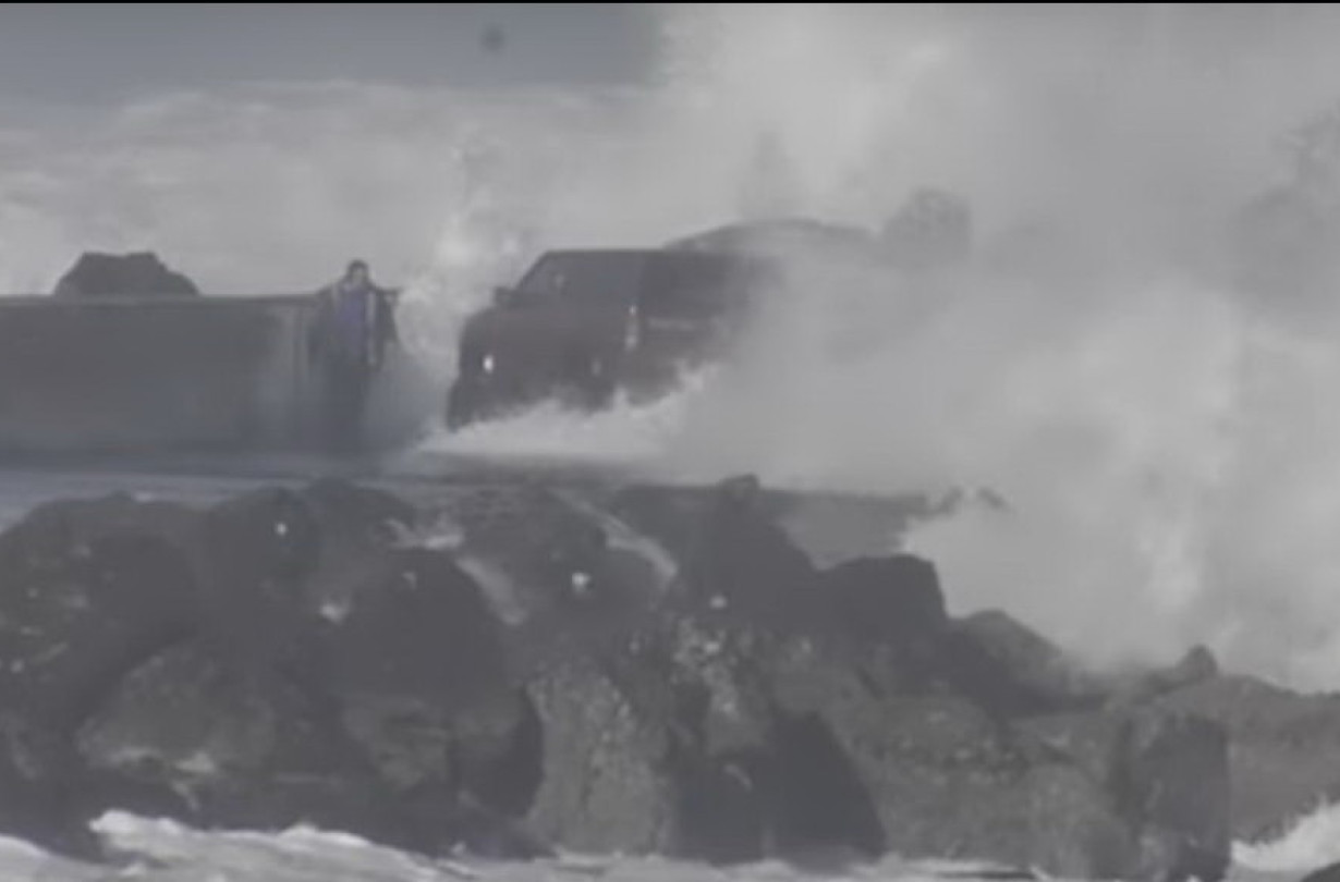 Ανατριχιαστικά πλάνα που δείχνουν οδηγό pick-up να αποκλείεται σε προβλήτα με κύματα 8 μέτρων και τελικά να σώζεται από ελικόπτερο.