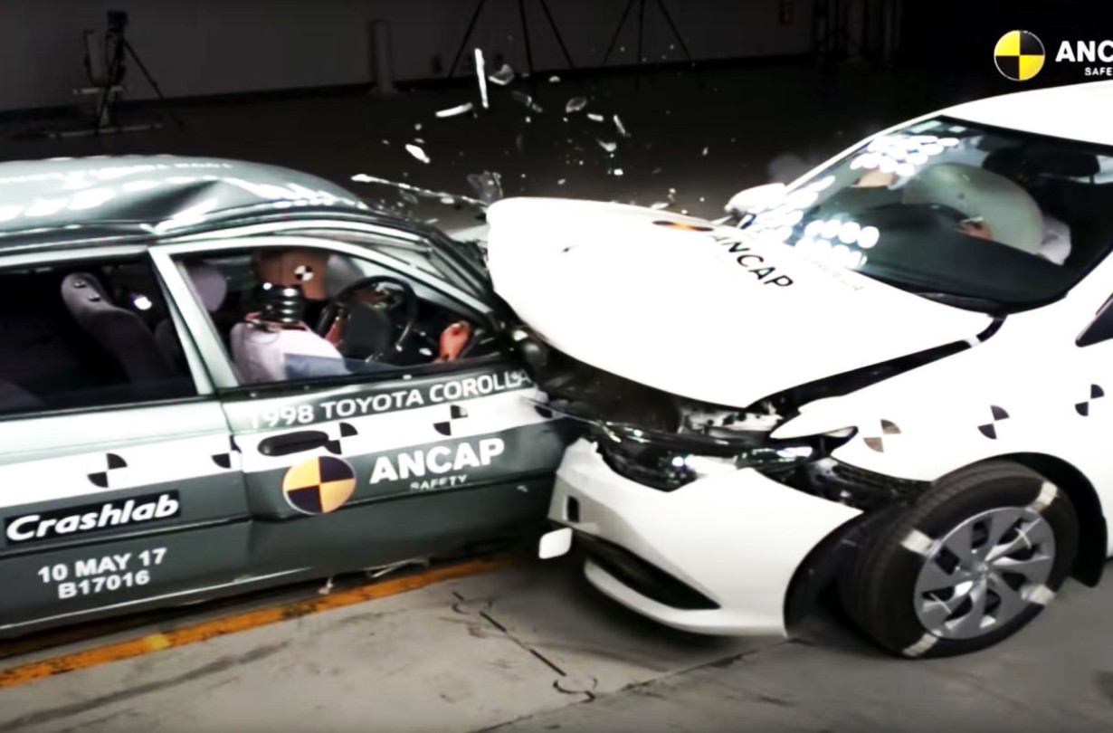 Το ANCAP, η Αρχή δοκιμών πρόσκρουσης νέων αυτοκινήτων για την Αυστραλία και τη Ν. Ζηλανδία υπέβαλλε σε μια δοκιμή πλαγιομετωπικής σύγκρουσης δύο Toyota Corolla διαφορετικής γενιάς, η μία του 1998 και η άλλη του 2015. Το video είναι αποκαλυπτικό.Αν και το μοντέλο του 1998 σχεδιάστηκε όταν είχαν ήδη καθιερωθεί οι δοκιμές πρόσκρουσης, το αυτοκίνητο κυριολεκτικά καταρρέει σε μια σύγκρουση με 64 km/h. Όπως φαίνεται καθαρά, ο θάλαμος των επιβατών στο αυτοκίνητο του 2015 παραμένει ουσιαστικά ανέπαφος, ενώ στο αυτοκίνητο του 198 συνθλίβεται. Θα πρέπει εδώ να σημειώσουμε ότι το 1998 δεν ήταν υποχρεωτικοί για την Αυστραλία και τη Ν. Ζηλανδία οι αερόσακοι, για αυτό το πράσινο αυτοκίνητο δεν διαθέτει. Αν και πάλι δεν θα έσωζαν τους επιβάτες. Είναι τόσο σοβαρή η παραμόρφωση της καμπίνας που ο αερόσακος δεν θα έκανε τίποτα.