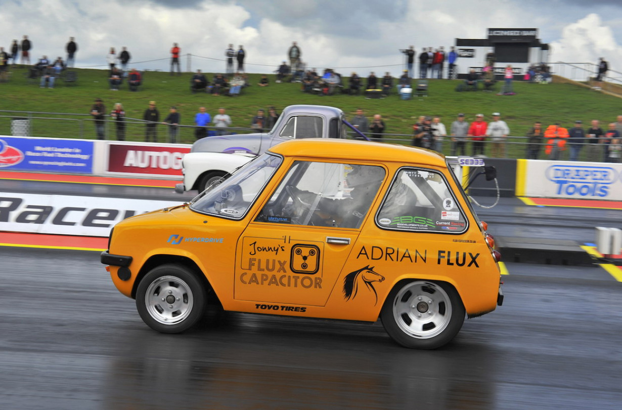 Όμως την περασμένη Κυριακή το Flux Capacitor, όπως το ονομάζει, στήθηκε δίπλα σε βενζινοκίνητα θηρία. Ο Smith δήλωσε συμμετοχή στην πολύ ανταγωνιστική κατηγορία Street Eliminator όπου αγωνίζονται μερικά από τα πιο γρήγορα αυτοκίνητα – όλα με πιστοποιητικό ΚΤΕΟ, σήμα τελών κυκλοφορίας και λάστιχα δρόμου.