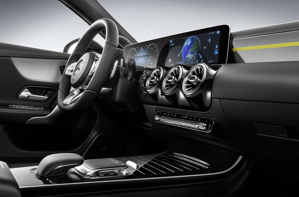 Το ταμπλό της νέας A-Class έχει σχεδίαση δύο επιπέδων και δυνατότητα οπίσθιου φωτισμού για μεγαλύτερη αίσθηση του χώρου. Στο πάνω τμήμα του, βρίσκουμε τις δύο wide screen που εκτελούν χρέη πίνακα οργάνων και συστήματος πολυμέσων. Βέβαια, από εκεί μπορούν να ρυθμιστούν και όλες οι λειτουργίες του μοντέλου, με τον υποψήφιο πελάτη να έχει αρκετές επιλογές ως προς το μέγεθός τους. Η βασική έκδοση έχει δύο οθόνες 7”, αλλά υπάρχει δυνατότητα για μία 7άρα και μία 10,25” ή δύο οθόνες των 10,25”.