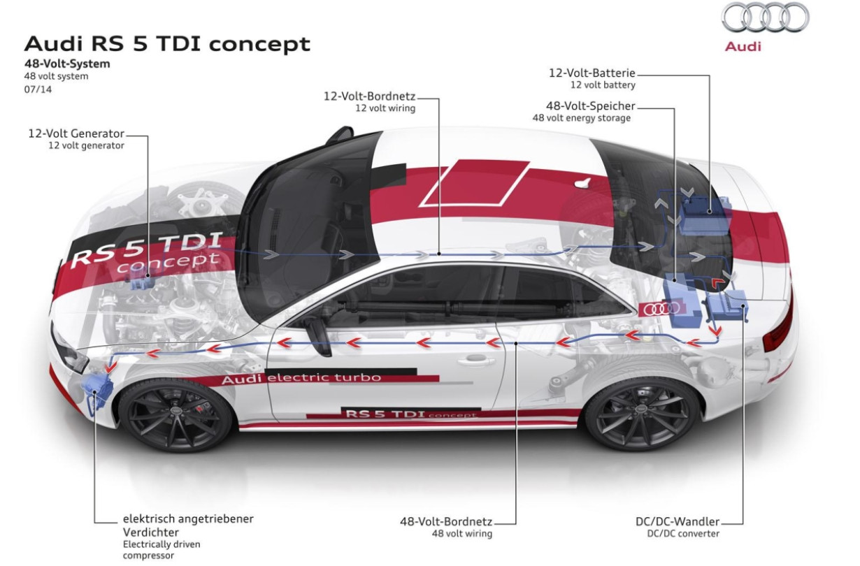 Ο 48V ηλεκτρικός υπερσυμπιεστής έκανε για πρώτη φορά την εμφάνισή του σε αυτοκίνητο του Ingolstadt στο πρωτότυπο Audi RS5 TDI. Όπως και το SQ7, διέθετε 48βολτο ηλεκτρικό σύστημα που τροφοδοτούσε ένα ηλεκτρικό τούρμπο. Αυτό το τελευταίο είχε το ρόλο να παρέχει βοήθεια πριν το ζεύγος των συμβατικών τούρμπο «φουσκώσει» τόσο έτσι ώστε να παρέχει βέλτιστο boost, εξαλείφοντας με αυτόν τον τρόπο την υστέρηση των τούρμπο.
