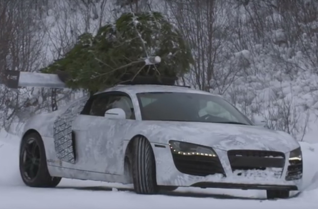 Όμως αυτό το βελτιωμένο R8 της Envision Group εξέδραμε στα χιονισμένα βουνά για να εκτελέσει με επιτυχία το γιορτινό καθήκον του να βρει, να κόψει και να μεταφέρει ένα χριστουγεννιάτικο έλατο.