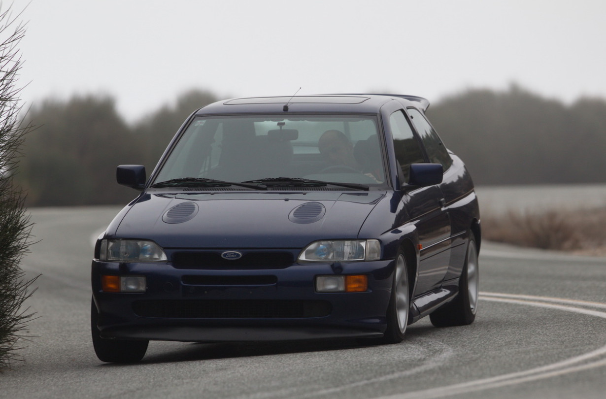 Ο ήλιος πασχίζει να φανεί μέσα από τα πυκνά σύννεφα που έχουν κατέβει χαμηλά, δίνοντας φόντο χιτσκοκικού θρίλερ σε αυτό το παγωμένο πρωινό. Το μαλακό φως χαϊδεύει τις πλούσιες καμπύλες του αμαξώματος και τα πληθωρικά αεροδυναμικά βοηθήματα. Είναι ώρα να αφήσουμε τις αναφορές σε παρελθοντικό χρόνο και να έρθουμε στο παρόν. Το μπλε Escort RS Cosworth είναι μπροστά μας, αναμμένο για να ζεσταθούν τα λάδια και τα νερά. Έτοιμο να το απολαύσουμε.