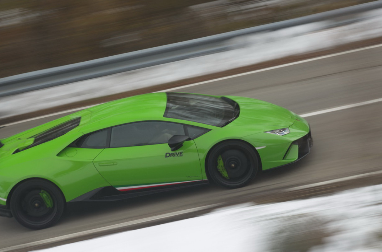 Φροντίζει για συγκλονιστικά γρήγορο ρυθμό χωρίς απώλεια ορμής σε γλιστρήματα, γι’ αυτό και μπορείς να επιταχύνεις δυνατά πριν από την κορυφή της στροφής χωρίς η Performante να αντιδρά καθόλου. Απλώς τινάζεται προς την έξοδο με το τιμόνι σχεδόν ίσιο και το κρεσέντο του V10 να υποστηρίζεται από βίαιες, χειροκίνητες αλλαγές από τα τεράστια σταθερά paddles.