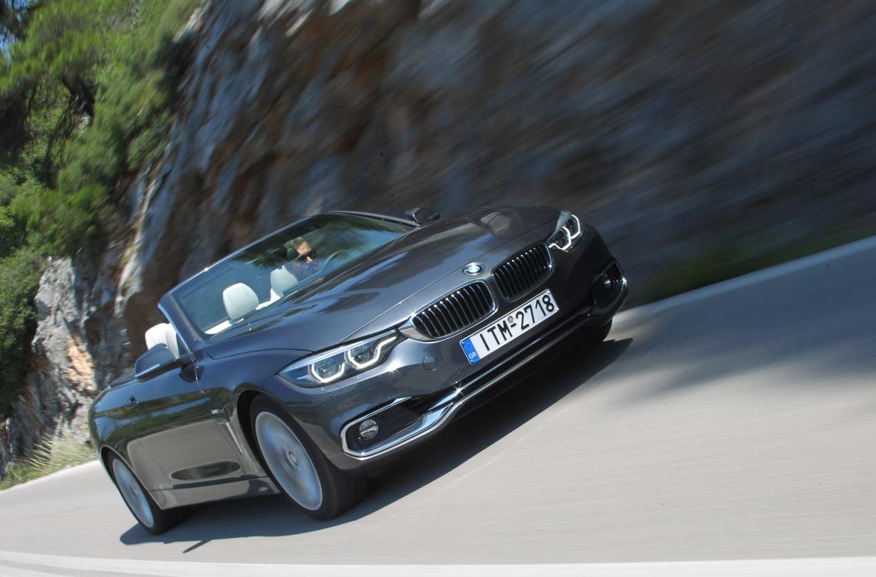 Αυτός είναι ο κανόνας και όπως κάθε κανόνας έχει και τις εξαιρέσεις του. Και μια από αυτές είναι η 430i Cabrio. Αν την κοιτάξεις κλειστή, κάτι η μεταλλική οροφή, κάτι οι γραμμές, με μια φευγαλέα ματιά μπορεί και να την μπερδέψεις με την Coupé. Μια δεύτερη πιο προσεκτική ματιά αποκαλύπτει την αληθινή της ταυτότητα.