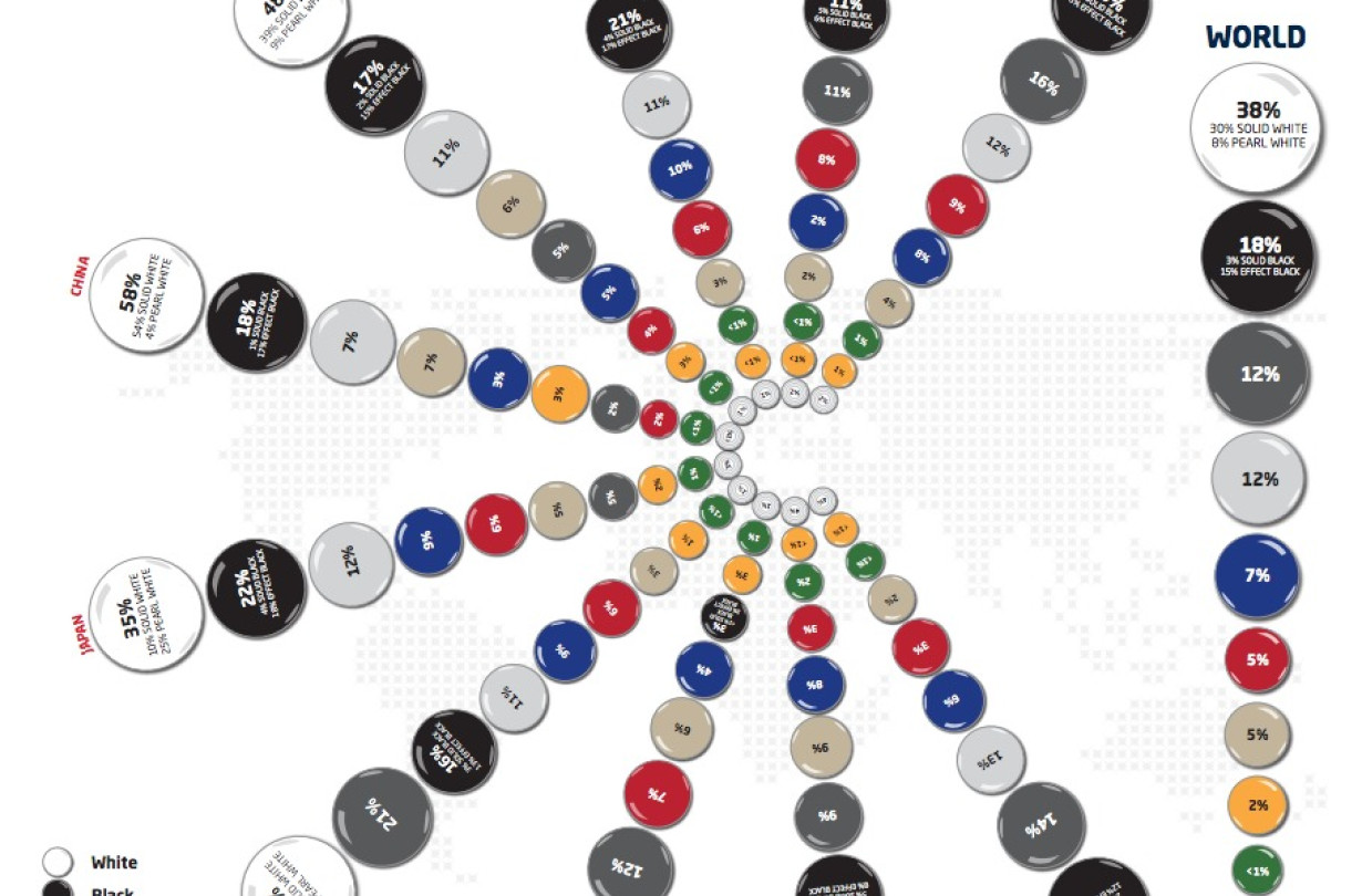 Είναι ενδιαφέρον να σημειωθεί ότι το λευκό είναι πιο δημοφιλές στην Ασία: 58% στην Κίνα και 48% σε όλη την Ασία, πολύ εμπρός από τις άλλες αποχρώσεις. Στην Ευρώπη, το λευκό κυριαρχεί πολύ λιγότερο με το μερίδιο αγοράς «μόνο» στο 25%, εμπρός από το γκρι (σε αντίθεση με την παγκόσμια τάση, λοιπόν) στο 22%.