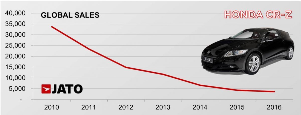 Ήταν η υβριδική εναλλακτική που υποτίθετο θα σημείωνε επιτυχία ανάλογη του Toyota Prius. Αντίθετα με τo Toyota, το Honda CR-Z είχε πιο σπορ look και μόνο τρεις πόρτες. Και αυτό ήταν το κύριο πρόβλημά του: Οι τρεις πόρτες. Το αυτοκίνητο λανσαρίστηκε σε μια περίοδο που οι καταναλωτές της κατηγορίας είχαν ήδη αρχίσει να κινούνται προς τα 5θυρα μοντέλα.