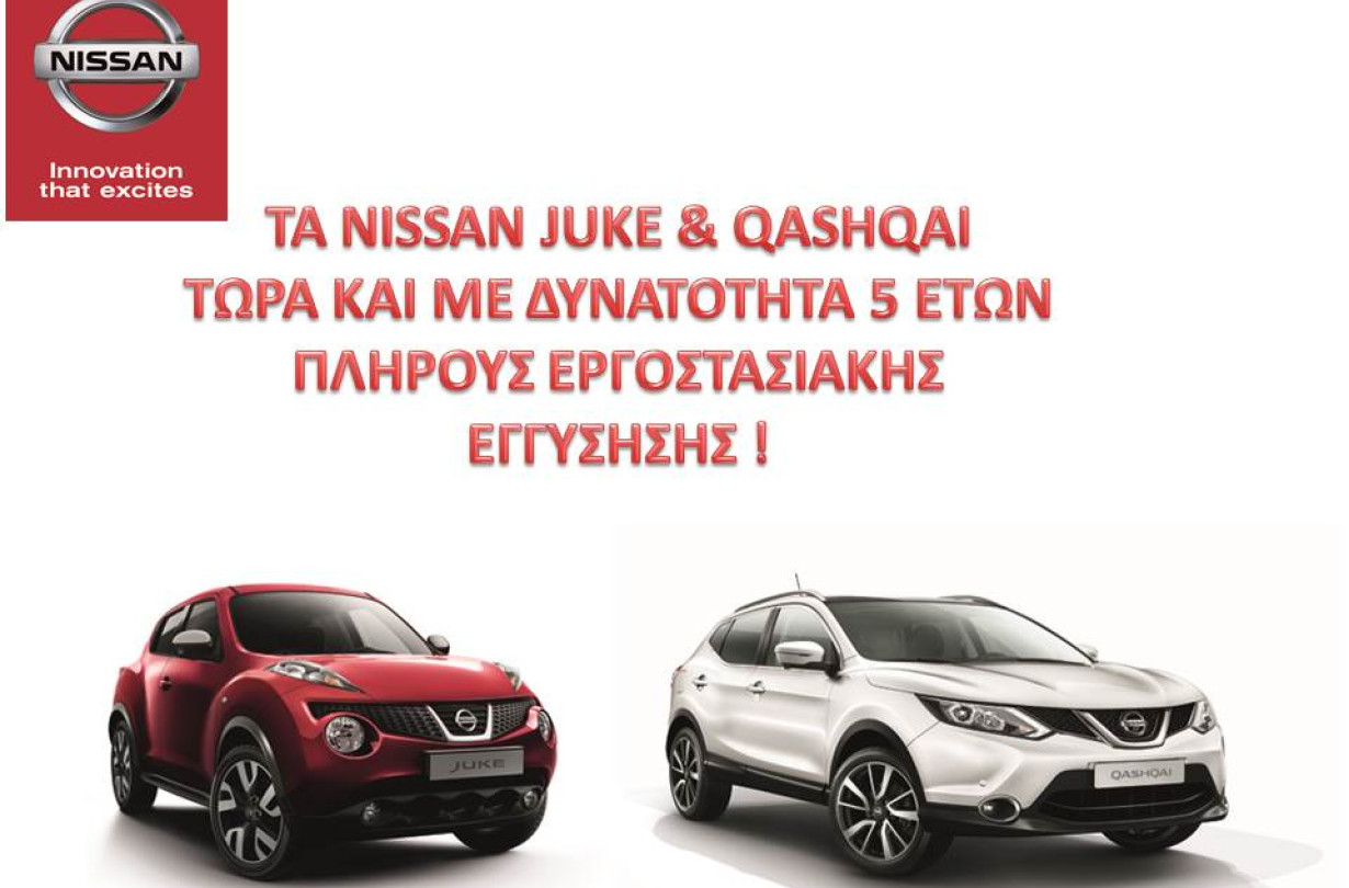 Η Nissan, θέλοντας να προσφέρει στους υποψήφιους αγοραστές αλλά και ήδη κατόχους Juke και Qashqai, περισσότερες και οικονομικότερες επιλογές για επέκταση της πλήρους εργοστασιακής εγγύησης των οχημάτων τους, δίνει τη δυνατότητα επιλογών αυτής και στα 5 έτη.