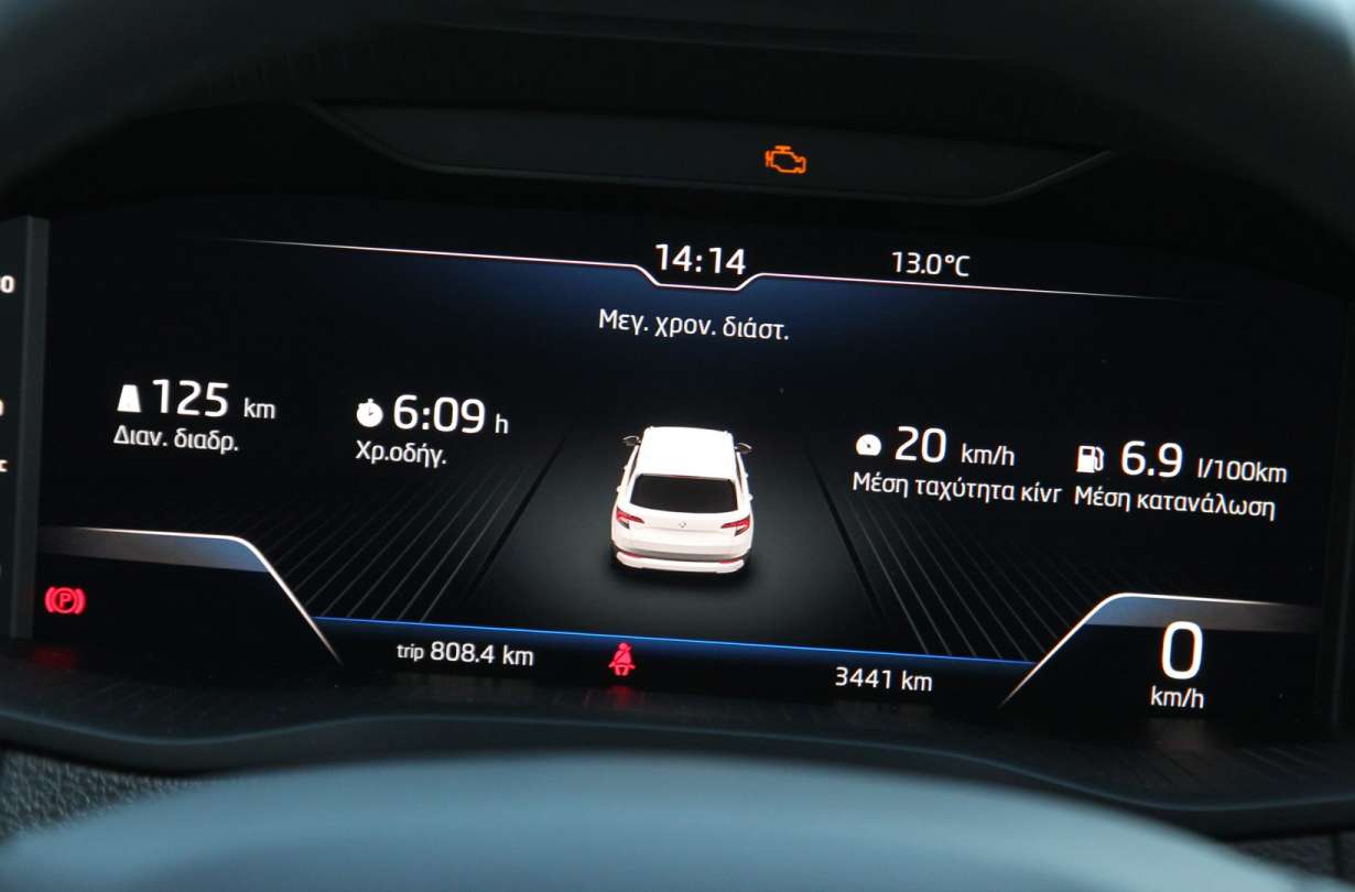 Η λειτουργία Modern καταργεί το στροφόμετρο και περιορίζει τις υπόλοιπες ενδείξεις σε δύο κατακόρυφα πλαίσια στα πλάγια της οθόνης. Στην κεντρική περιοχή μπορεί να εμφανίζεται ο χάρτης του συστήματος πλοήγησης –το οποίο όμως απουσίαζε από το Karoq της δοκιμής μας. Η Extended όψη είναι ακόμα καλύτερη για τα αυτοκίνητα που έχουν navi, αφού επεκτείνει το χάρτη σε όλη την οθόνη, ενώ στα υπόλοιπα εμφανίζει πιο απλωμένες τις ενδείξεις του υπολογιστή ταξιδίου ή του infotainment. Οι δύο όψεις που εκτιμήσαμε περισσότερο εμείς πάντως, είναι η Sport και η Basic.