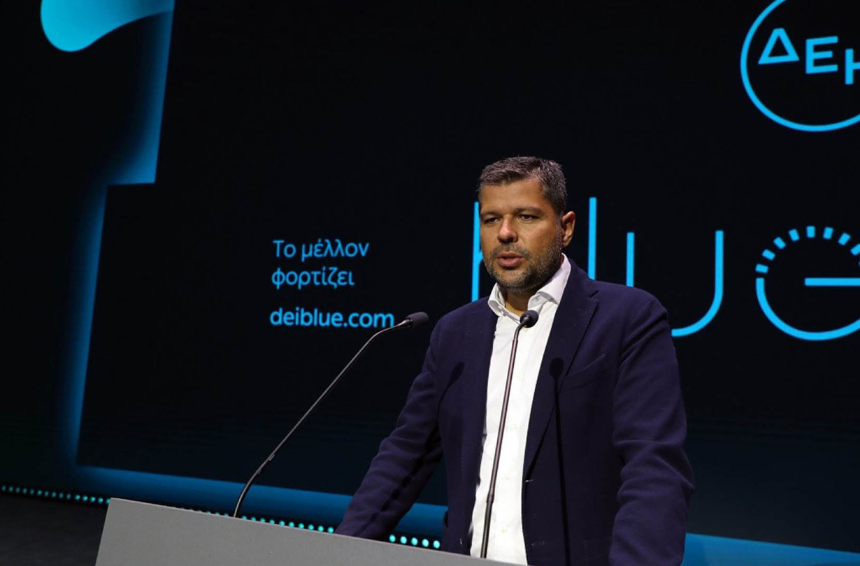 Υποδεχόμαστε σήμερα τη ΔΕΗ blue. Μέσα από μία νέα μάρκα και ένα νέο σύμβολο που αναδεικνύει όλα αυτά που είναι η ηλεκτροκίνηση για εμάς: το καθαρό περιβάλλον, το γαλάζιο της ενέργειας, του ουρανού και της καθαρής θάλασσας. Η ΔΕΗ blue είναι η ηλεκτροκίνηση».