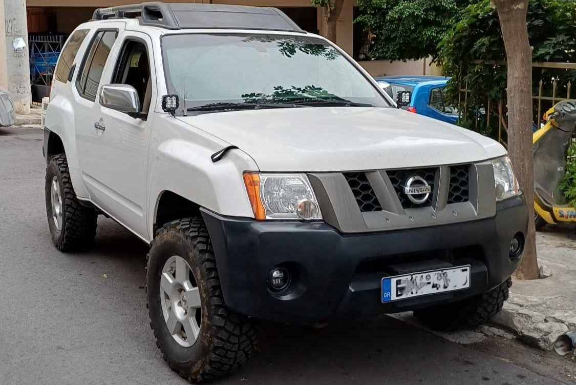 Η εμφάνιση του αυτοκινήτου της φωτογραφίας προδίδει έναν οδηγό που το έχει ετοιμάσει για περιπέτεια: Τα all-terrain λάστιχα με το βαθύ πέλμα, οι επιπλέον προβολείς στο καπό και το σνόρκελ στη δεξιά πλευρά δείχνουν ότι το Xterra δεν προορίζεται μόνο για να καβαλάει πεζοδρόμια στο Κερατσίνι.