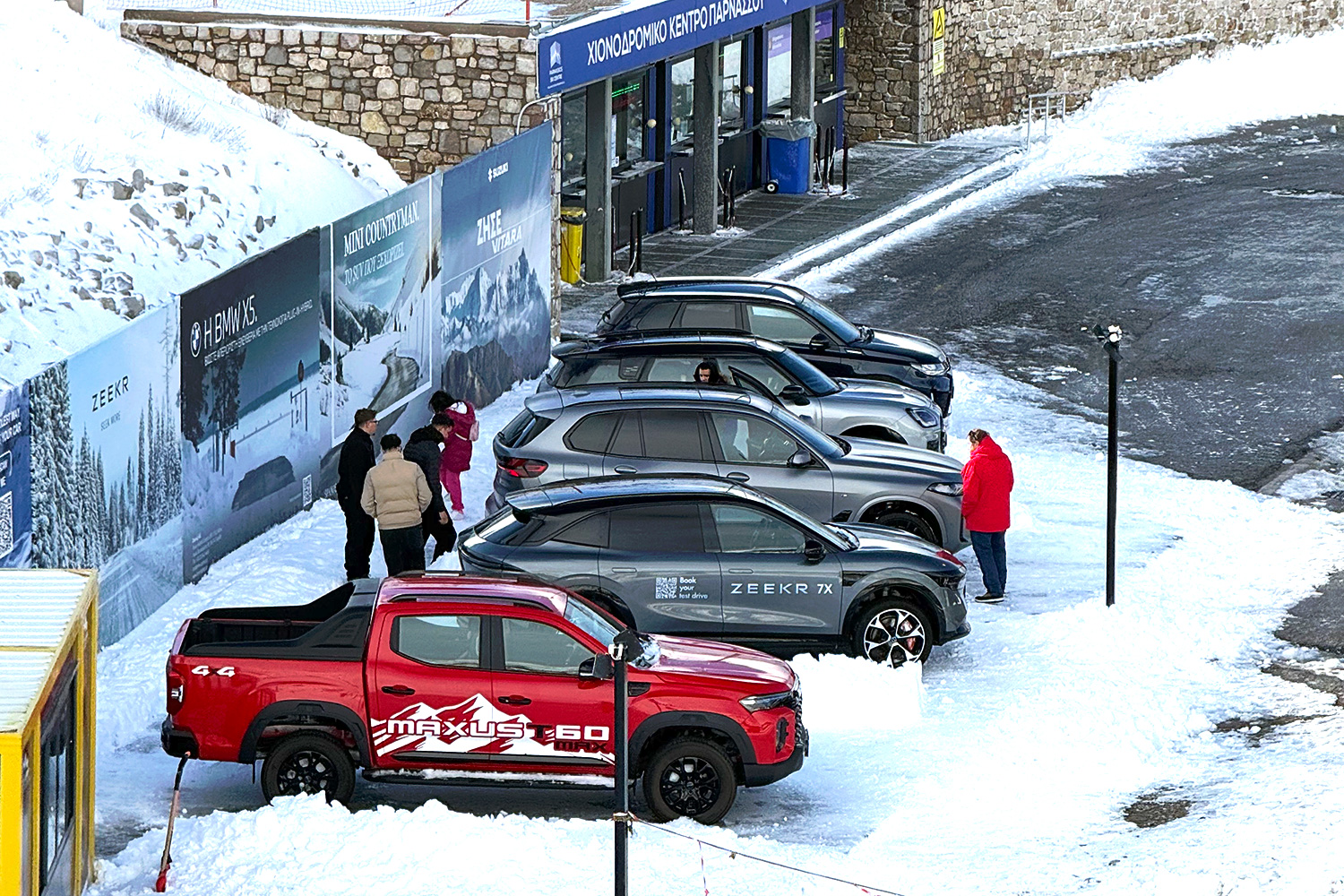 Στο Χιονοδρομικό Κέντρο Παρνασσού, οι επισκέπτες έχουν την ευκαιρία να γνωρίσουν από κοντά μοντέλα όπως τα Suzuki Vitara, MINI Countryman, BMW X5 50e, Zeekr 7X και Maxus T60, δοκιμάζοντας την πραγματική τους απόδοση σε υψόμετρο και απαιτητικές συνθήκες.