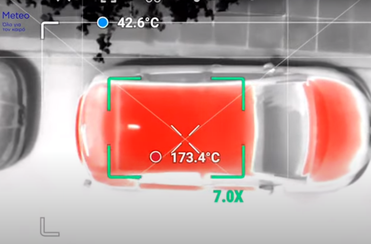 Με τη βοήθεια ενός drone με θερμική κάμερα και ενός θερμομέτρου η Up Stories και το meteo.gr, έκαναν ένα πείραμα για τις θερμοκρασίες που αναπτύσσονται μέσα σε αυτοκίνητα αυτές τις ημέρες και που ξεπέρασαν, όπως φάνηκε, τους 179 βαθμούς Κελσίου στην οροφή και τους 50 βαθμούς Κελσίου στο εσωτερικό.