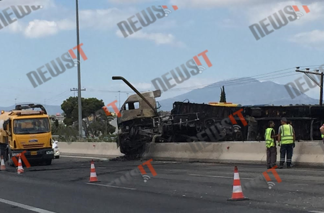 Λίγο ύστερα από τις 12 το μεσημέρι, στα 500 m στο ύψος των παλιών διοδίων στο ρεύμα προς Λαμία, έσκασε το λάστιχο του φορτηγού το οποίο στη συνέχεια καβάλησε το στηθαίο, ανετράπη και τυλίχθηκε στις φλόγες. Ο οδηγός κατάφερε και βγήκε από φλεγόμενο όχημα και μεταφέρθηκε στο κέντρο υγείας Σχηματαρίου με ελαφρύ τραυματισμό.