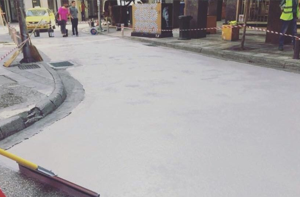 Στη συγκεκριμένη οδό του Εμπορικού Τριγώνου πραγματοποιήθηκε δοκιμαστική τοποθέτηση του CoolSeal την περασμένη Κυριακή. Η τοποθέτηση έγινε κατά τη διάρκεια της ημέρας, εξαιτίας των ιδιαίτερων προδιαγραφών του υλικού, έτσι ώστε να διασφαλιστεί η άρτια σταθεροποιήσή του. Ο καιρός όμως δεν ήταν με το μέρος του Δήμου. Το υλικό πρέπει να παραμείνει στεγνό για τις πρώτες 24 ώρες από την τοποθέτησή του, κάτι που λόγω των βροχοπτώσεων αυτών των ημερών, δεν έγινε. Έτσι, η λευκή επίστρωση ξεθώριασε, και πρόκειται να ξαναπεραστεί, όπως επιβεβαιώνει η αρμόδια αντιδήμαρχος Ελένη Μυριβίλη.
