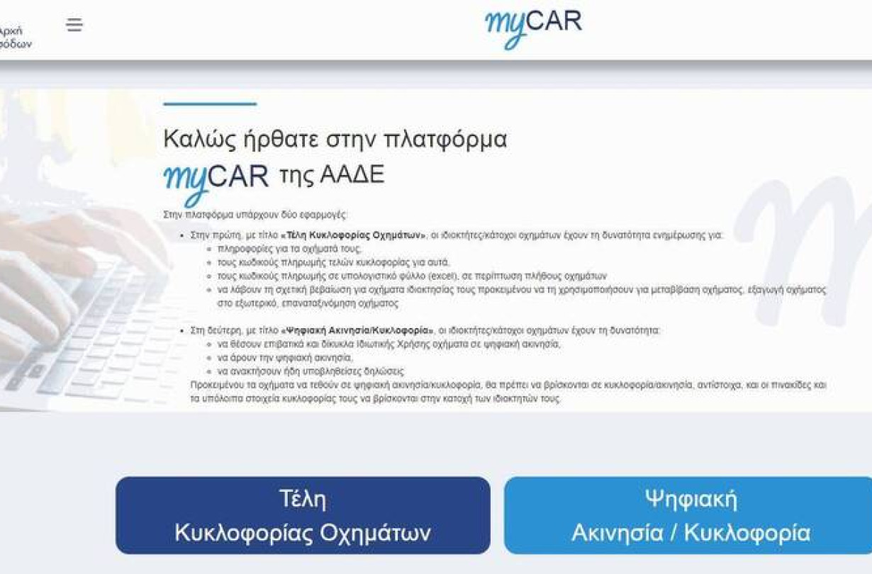 Οι ιδιοκτήτες αφού πληκτρολογήσουν mycar.aade.gov.gr, και περάσουν το user name και το password τους στο myTAXISnet, οδηγούνται στην αρχική σελίδα των τελών κυκλοφορίας, όπου έχουν δύο επιλογές εφαρμογών: