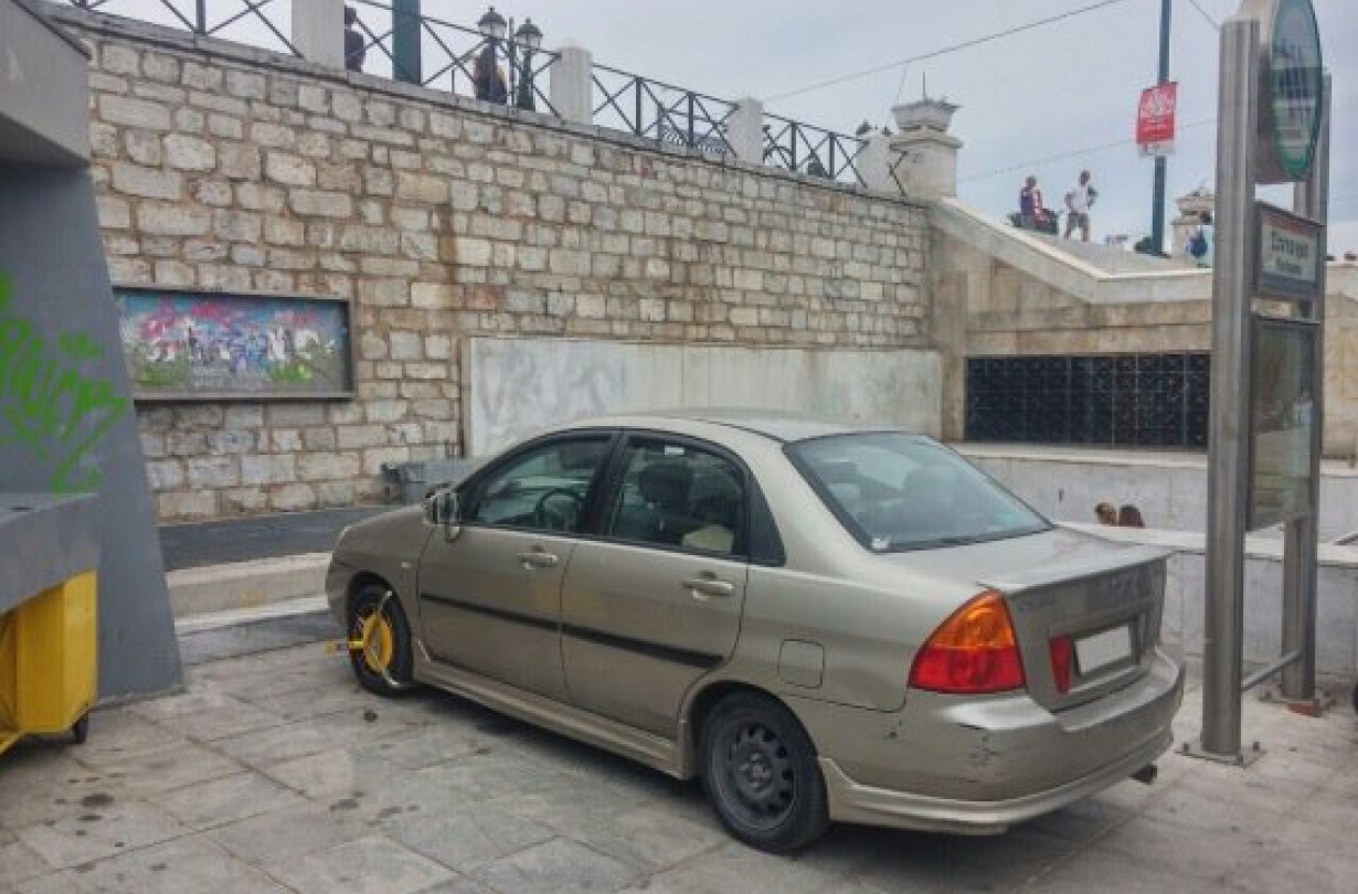 Όμως ο συγκεκριμένος οδηγός της φωτογραφίας φαίνεται πως το παράκανε. Όχι μόνον καβάλησε όλη την πλατεία Συντάγματος αλλά πήγε και πάρκαρε δίπλα στην έξοδο του Μετρό.