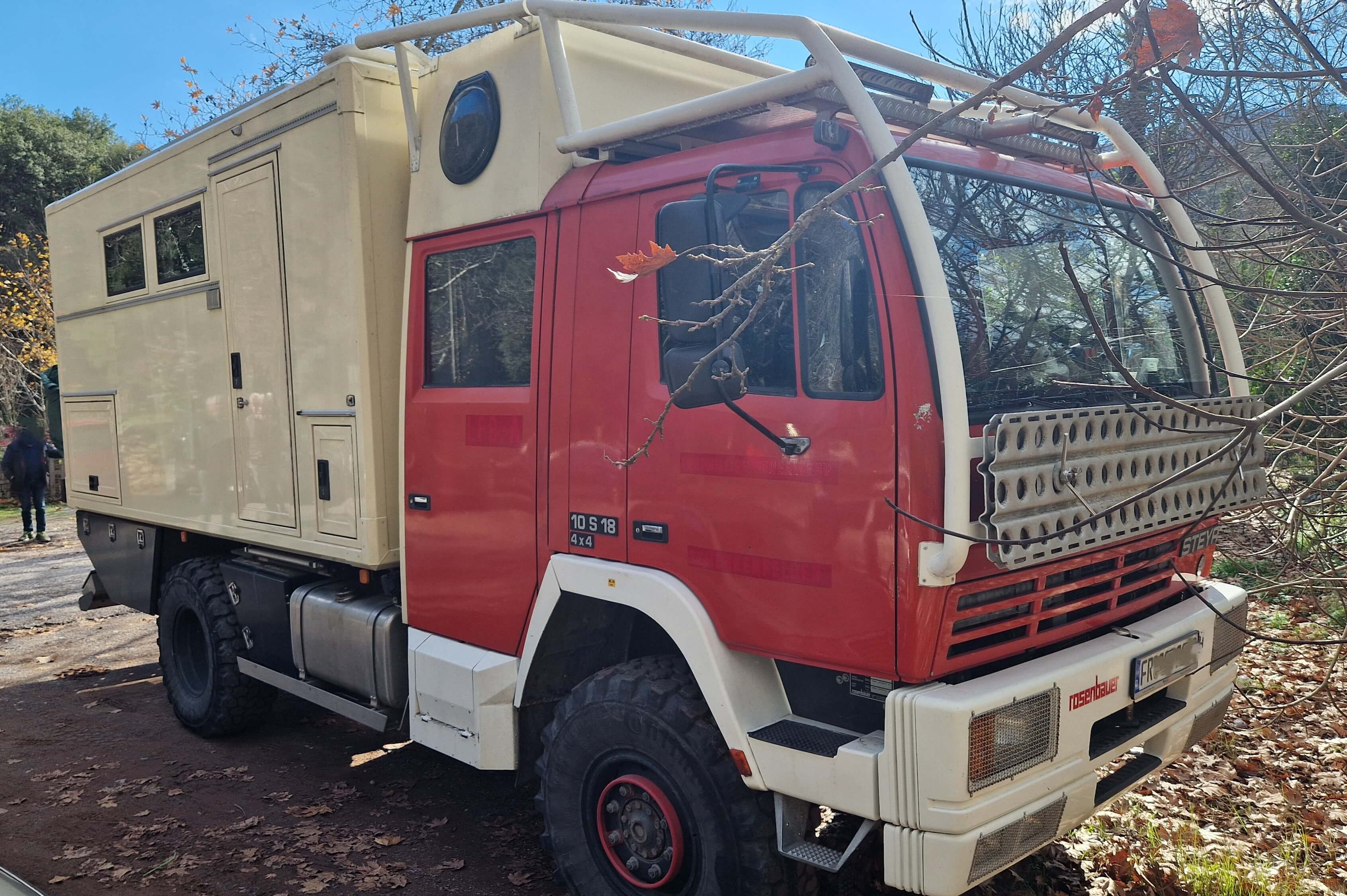 Το συγκεκριμένο Steyr δεν ξεκίνησε την καριέρα του ως πολυτελές «τροχόσπιτο». Η κατακόκκινη καμπίνα του και το όνομα Rosenbauer στον εμπρός προφυλακτήρα μαρτυρούν το παρελθόν του ως πυροσβεστικό όχημα στην Αυστρία ή τη Γερμανία. Αυτά τα οχήματα αποτελούν την ιδανική βάση για μετατροπές overland, καθώς είναι συντηρημένα με ευλάβεια, έχουν λίγα χιλιόμετρα στο κοντέρ και είναι χτισμένα για να αντέχουν σε ακραίες καταπονήσεις.