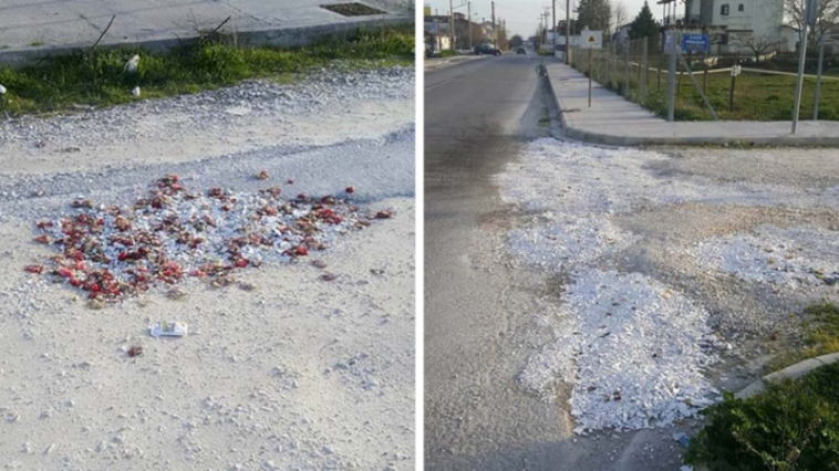 Θεϊκό: Μπάλωσαν λακκούβες σε δρόμο με σπασμένα πιάτα από μπουζούκια