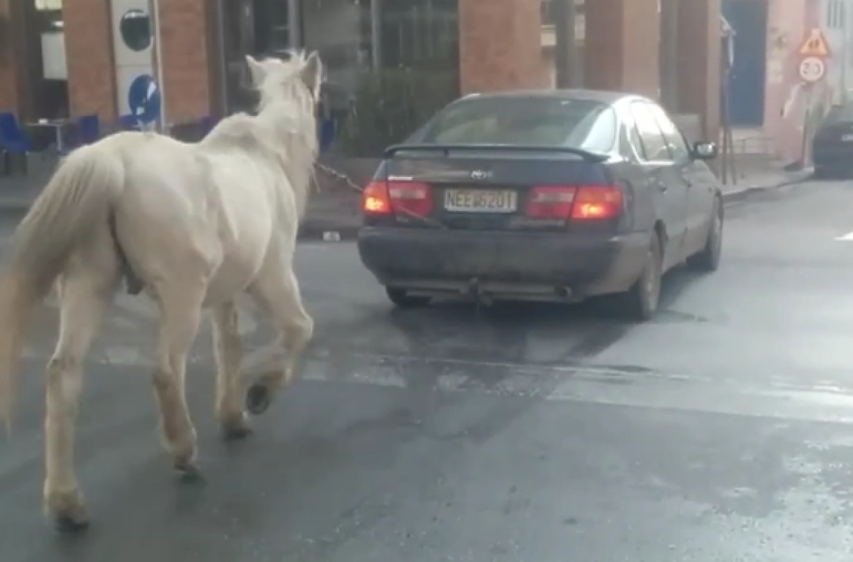 Κάποιος αποφάσισε ότι ο ιδανικός τρόπος μεταφοράς ενός αλόγου στους δρόμους της Θεσσαλονίκης είναι να το δέσει πίσω από το αυτοκίνητό του.