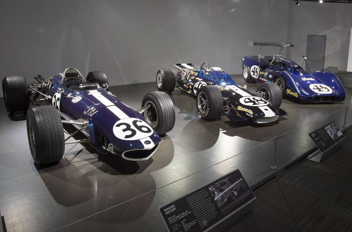 Στην άλλη προθήκη, απέναντι από τη σαμπάνια του Le Mans του ’67 είναι ένα κομμάτι αεροδυναμικής πτέρυγας με Gurney Flap. Ο Dan είχε ανακαλύψει ότι προσθέτοντας ένα μικρό κάθετο στοιχείο στο χείλος εκφυγής του φτερού κέρδιζε πολύ downforce με ελάχιστη απώλεια σε τελική ταχύτητα. Δοκιμάστηκε για πρώτη φορά το ’71 στο Phoenix International Raceway. Και έδωσε στο μονοθέσιο τη δυνατότητα να διαλύσει το ρεκόρ γύρου στην Ινδιανάπολη, ξεπερνώντας το κατά 27,5 km/h μ.ω.τ.