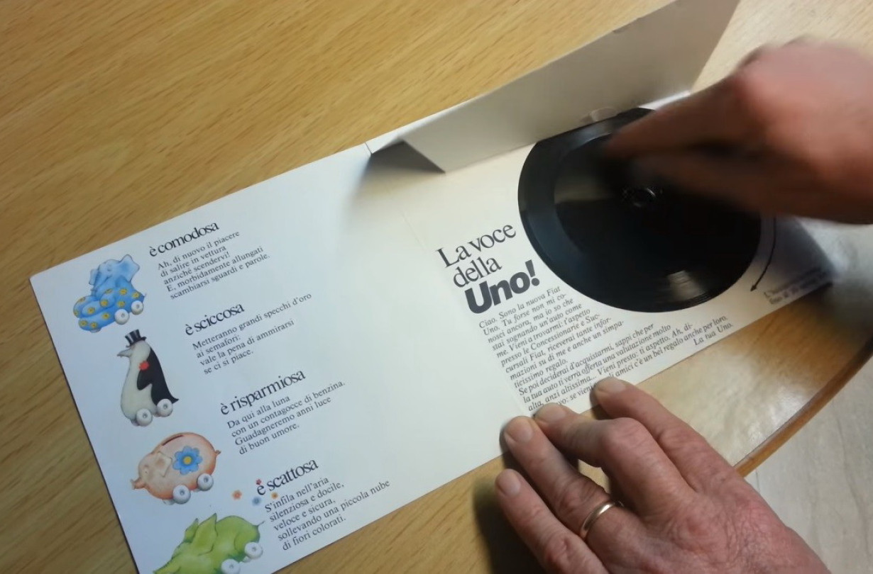 Το διαφημιστικό φυλλάδιο περιείχε δίσκο βινυλίου που τον γύριζες με το χέρι και άκουγες το Uno να σου μιλάει!