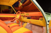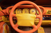 Εκεί, το δέρμα έχει καταπιεί κάθε εκατοστό επιφάνειας. Από τους αεραγωγούς και τους διακόπτες των παραθύρων μέχρι τα όργανα, τα πάντα είναι ντυμένα σε έναν συνδυασμό κίτρινου, απαλού πορτοκαλί και ξύλου. Ακόμα και για τα δεδομένα των 90s, το αποτέλεσμα είναι οπτικά εκκωφαντικό.