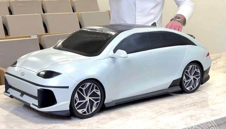 Αρχικά δημιουργεί ένα μεγάλο ορθογώνιο από σοκολάτα και σχεδιάζει τη σιλουέτα του Ioniq 6. Λυγίζει κομμάτια υλικού για να σχηματίσει τμήματα όπως το καπό, το παρμπρίζ κι η οροφή.