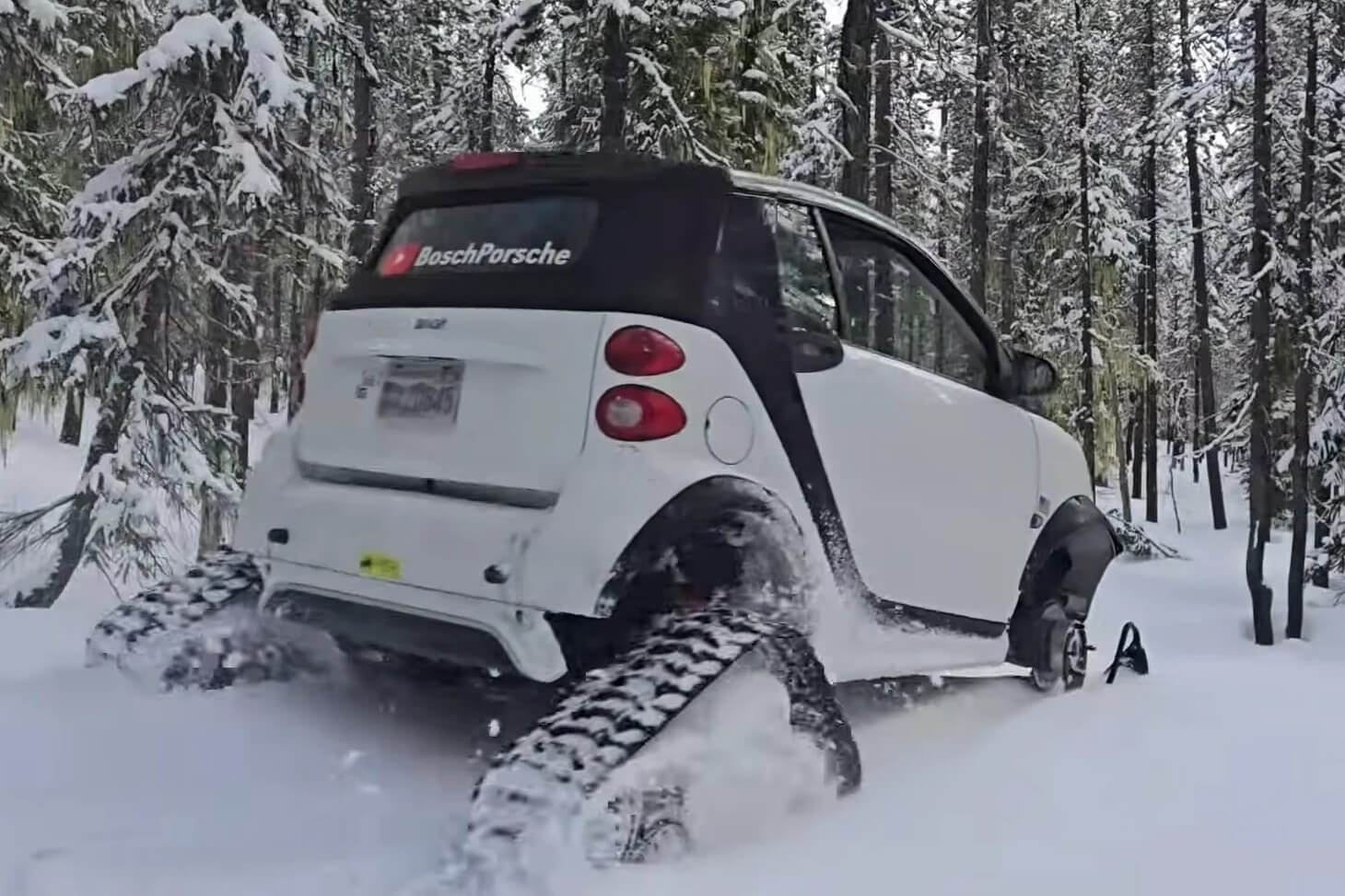 Το αποτέλεσμα; Ένα υβριδικό όχημα που μοιάζει βγαλμένο από ταινία επιστημονικής φαντασίας ή από κάποιο ακραίο βίντεο του YouTube. Παρά την αλλόκοτη εμφάνισή του, το «χιονο-Smart» αποδείχθηκε εξαιρετικά ικανό στην πράξη.