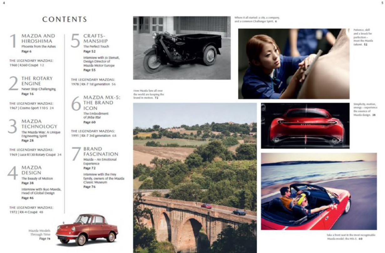 Όλη η ιστορία της θρυλικής μάρκας που ακολουθεί το ασυμβίβαστο και προκαλεί το κατεστημένο, φιλοξενείται σε ένα πολύ όμορφο αφιέρωμα που ετοιμάστηκε από την Mazda Motor Europe. Ξεκινώντας από την πόλη καταγωγής της μάρκας, την ηρωική Χιροσίμα, οι σελίδες του βιβλίου μας ξεναγούν σε όλα τα σημαντικά γεγονότα που χάραξαν την αιωνόβια ιστορία της μάρκας.
