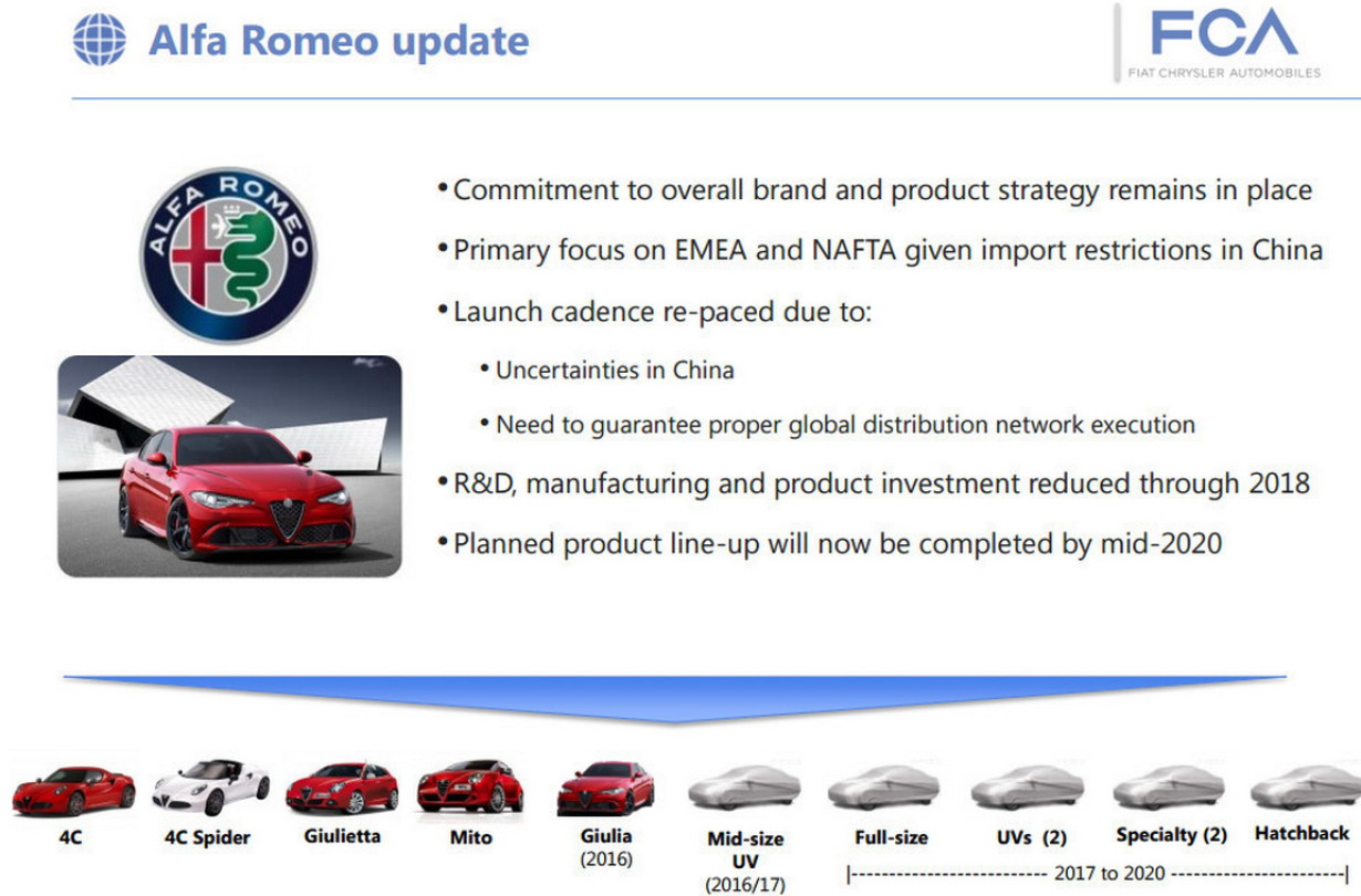 Η Alfa Romeo ήταν αόριστη, αλλά το αρχικό 5ετές πλάνο ανάπτυξης της εταιρείας περιελάμβανε οκτώ διαφορετικά μοντέλα μέχρι το τέλος του 2018. Το νέο πλάνο είναι κατά το μεγαλύτερο μέρος απαράλλαχτο, όσον αφορά τα μοντέλα, αλλά η ολοκλήρωσή του μετατέθηκε για το μέσον του 2020, όπως ανεπισήμως γνωρίζαμε ήδη από διαρροή επίσημου εγγράφου.