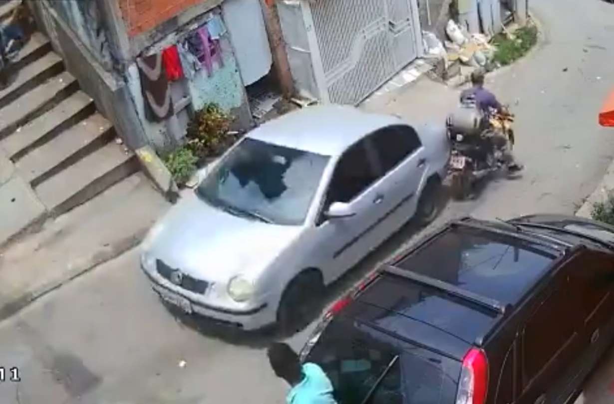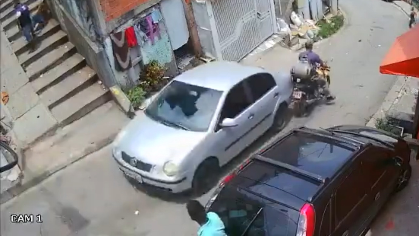 Το αυτοκινητικό κομμάτι από μόνο του πρόκειται για μια τρελή και ανεκδιήγητη φάση, που δεν μπορείς να καταλάβεις αν ο οδηγός του VW Polo σεντάν επιταχύνει ή αν η κατηφόρα έχει τέτοια κλίση που δημιουργεί την εντύπωση ότι συμβαίνει το πρώτο. Ο δυστυχής μοτοσικλετιστής προσπαθεί μάταια να κρατηθεί όρθιος, καταλήγοντας τελικά περίπου σάντουιτς μεταξύ του Polo κι ενός παρκαρισμένου αυτοκινήτου