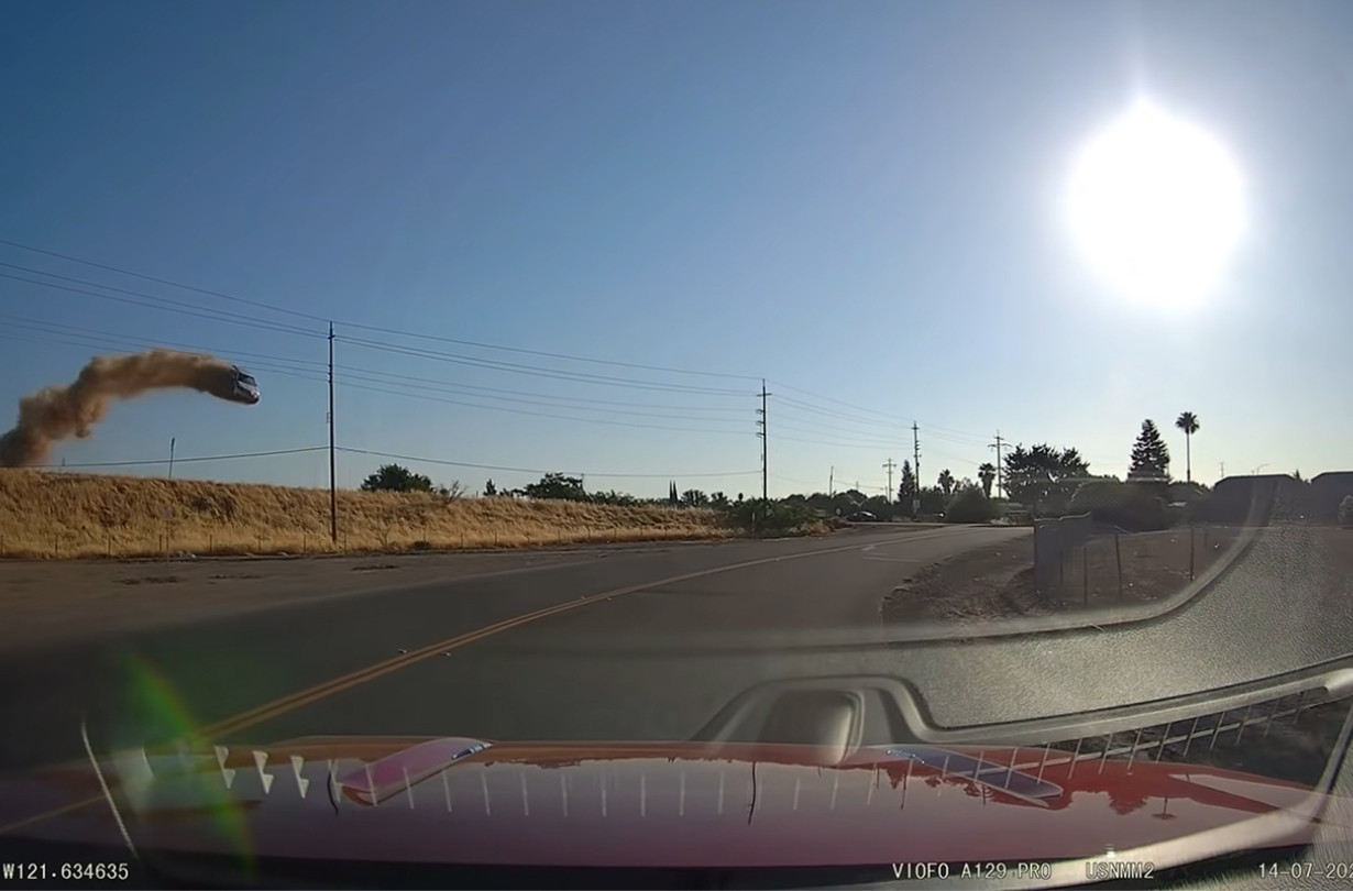 Η κάμερα κατέγραψε την τρελή πτήση ενός αυτοκινήτου σε αυτοκινητόδρομο της Καλιφόρνιας.