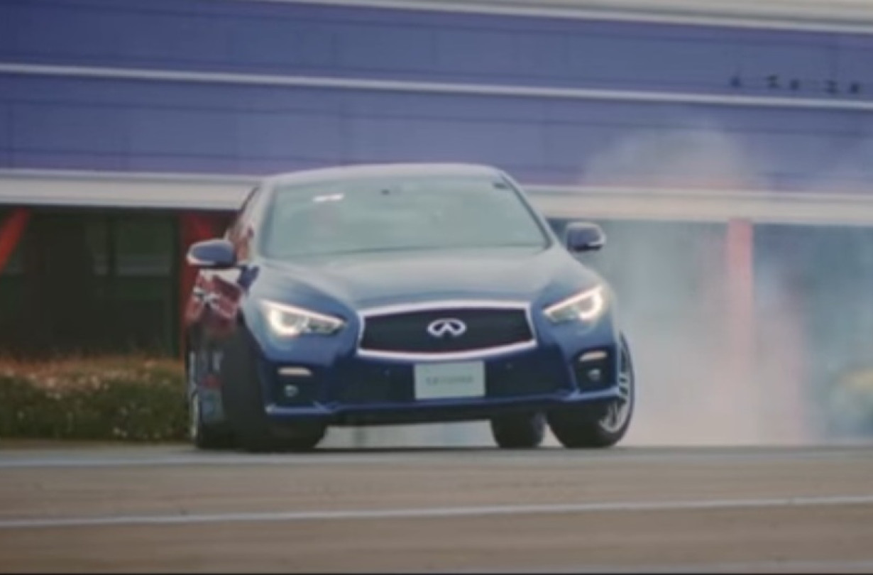 Το σποτάκι –για την ιαπωνική αγορά– δείχνει τον βετεράνο οδηγό αγώνων Michael Krumm να οδηγεί ένα μπλε Skyline (Infiniti Q50 σε Ευρώπη και Αμερική), προσπαθώντας να μείνει μέσα στις μπλε γραμμές μιας στενής και στριφτερής διαδρομής που έχει σχεδιαστεί σε ένα άδειο πάρκινγκ.