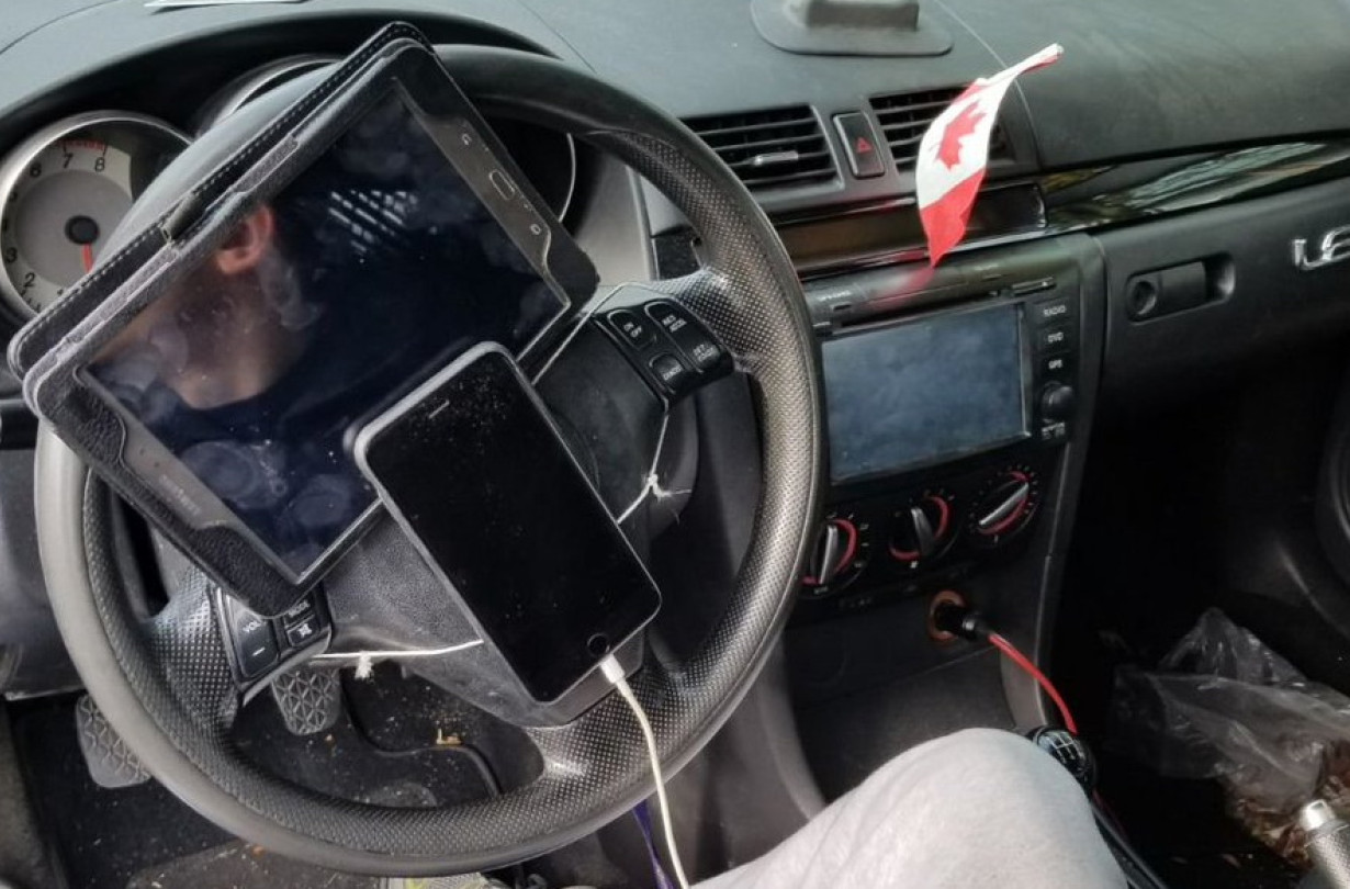 Η αστυνομία του Vancouver, στον Καναδά, σταμάτησε έναν οδηγό διότι φορούσε ακουστικά, και ανακάλυψε ότι αυτά ήταν συνδεδεμένα με ένα smartphone, που ήταν δεμένο στο τιμόνι μαζί με ένα tablet!