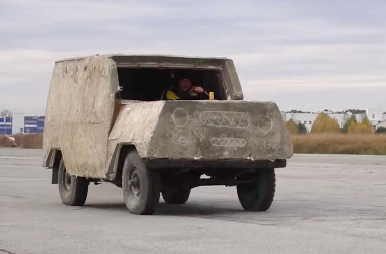 Οι Ρώσοι έκαναν βόλτες με το τσιμεντένιο UAZ σε μια αλάνα, χτυπώντας αλύπητα ένα Lada. Παρά τις πολλαπλές συγκρούσεις, το UAZ δεν υπέστη σοβαρές ζημιές, σε αντίθεση με το Lada που τσαλακώθηκε σαν χαρτί. Εκτός από το βίντεο με τις δοκιμασίες, ενδιαφέρον έχει και η διαδικασία κατασκευής που περιλαμβάνει ξύλινα καλούπια και μια μπετονιέρα.