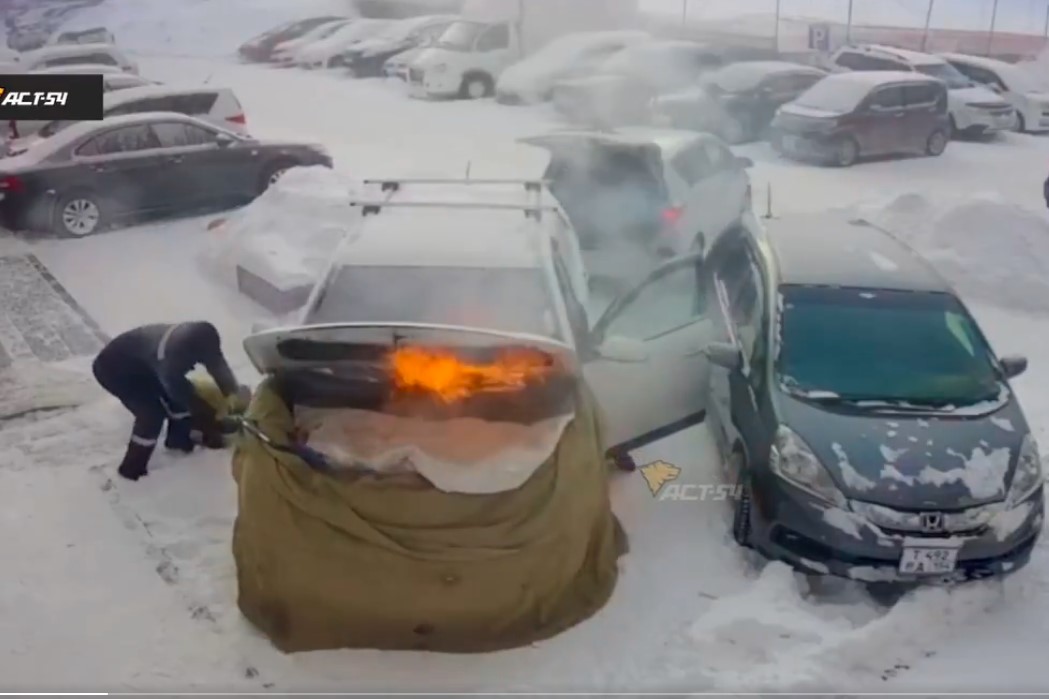 Το βίντεο απεικονίζει ένα άτομο να χρησιμοποιεί ένα πιστόλι θερμού αέρα για να ξεπαγώσει το κάτω μέρος ενός Kia Sorento σε χιονισμένο πάρκινγκ του Νοβοσιμπίρσκ, αλλά λίγο αργότερα φλόγες ξεπηδούν από το μηχανοστάσιο. Παρά τις προσπάθειές του οδηγού κι ενός ακόμη άνδρα που σπεύδει για να βοηθήσει στην κατάσβεση χρησιμοποιώντας χιόνι, το αυτοκίνητο καίγεται ολοσχερώς.
