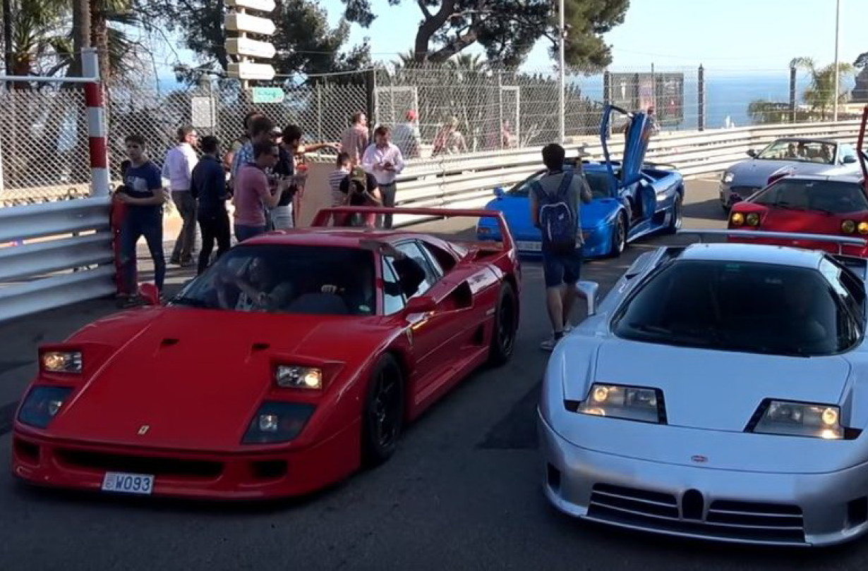 Ένα υπέροχο κομβόι supercars εμφανίστηκε στους δρόμους του Monaco, με μια πολύ γνωστή στους δρόμους του Πριγκιπάτου Ferrari F40 μπροστά κι από πίσω της μια Bugatti EB110, μια Lamborghini Diablo SV, μια Lamborghini Countach 25th Anniversary, με λίγα λόγια οι πιο δυνατές εφηβικές μας φαντασιώσεις.