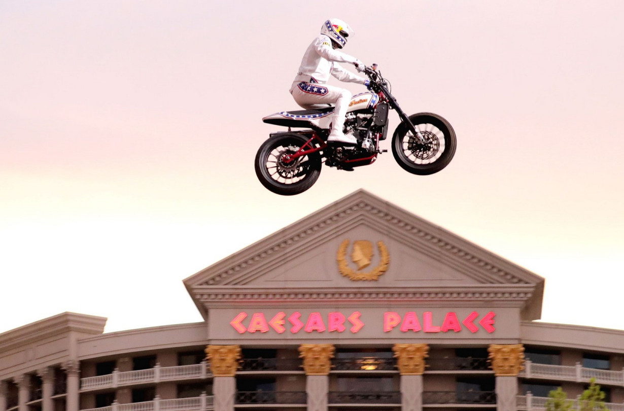 Το πρώτο από τα ακροβατικά είναι αυτό που έκανε τον Knievel γνωστό σε όλους, αλλά και λίγο έλειψε να τον σκοτώσει. Πρόκειται για το άλμα 43 μέτρων πάνω από το σιντριβάνι του ξενοδοχείου Caesar’s Palace, στο Las Vegas, που ο Knievel το επιχείρησε για πρώτη φορά το 1967.