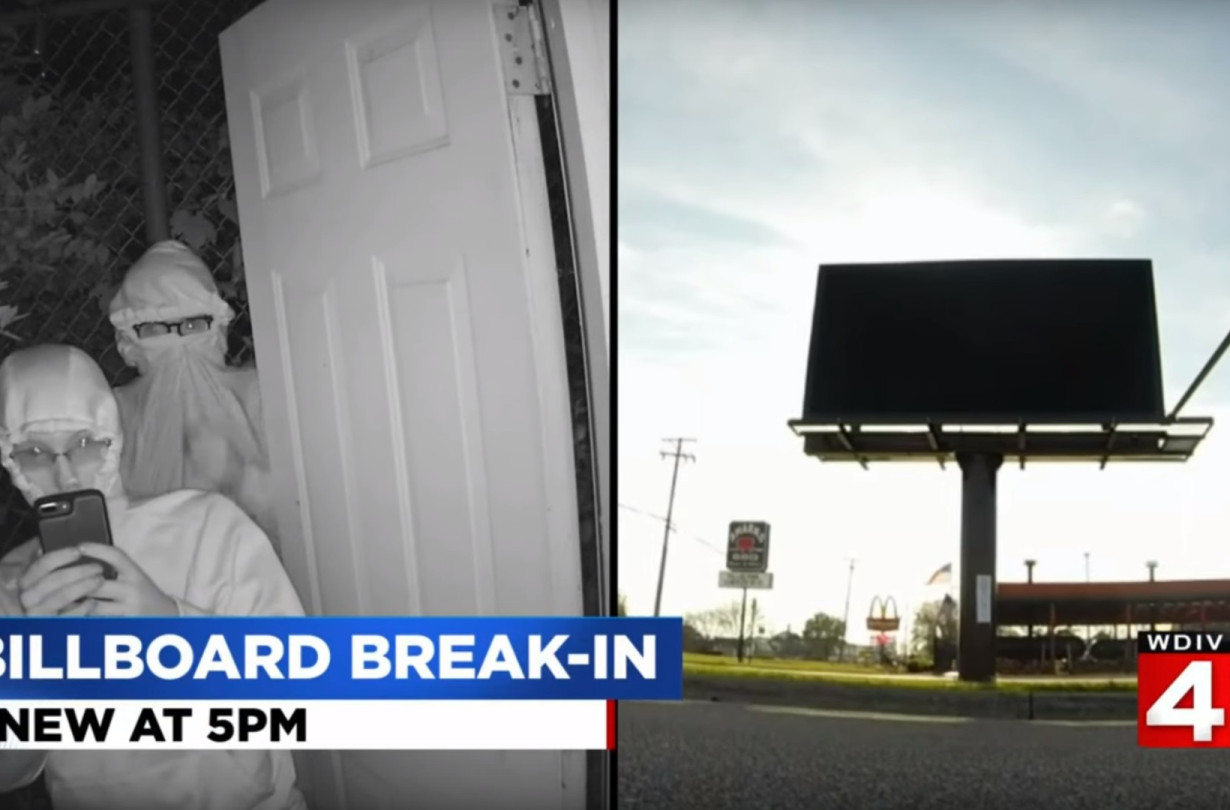Σε βίντεο από κάμερες ασφαλείας φαίνονται δύο νέοι με κουκούλες να εισβάλουν στο δωμάτιο ελέγχου της πινακίδας. Οι δράστες απέκτησαν πρόσβαση σε λάπτοπ συνδεδεμένο με την πινακίδα και στη συνέχεια φόρτωσαν τα ακατάλληλα βίντεο. Η κακόγουστη φάρσα των δύο νεαρών που πιθανότατα είναι φοιτητές από κοντινό κολέγιο, πήρε μεγάλη έκταση όταν μεγάλα αμερικανικά δίκτυα κάλυψαν το περιστατικό.