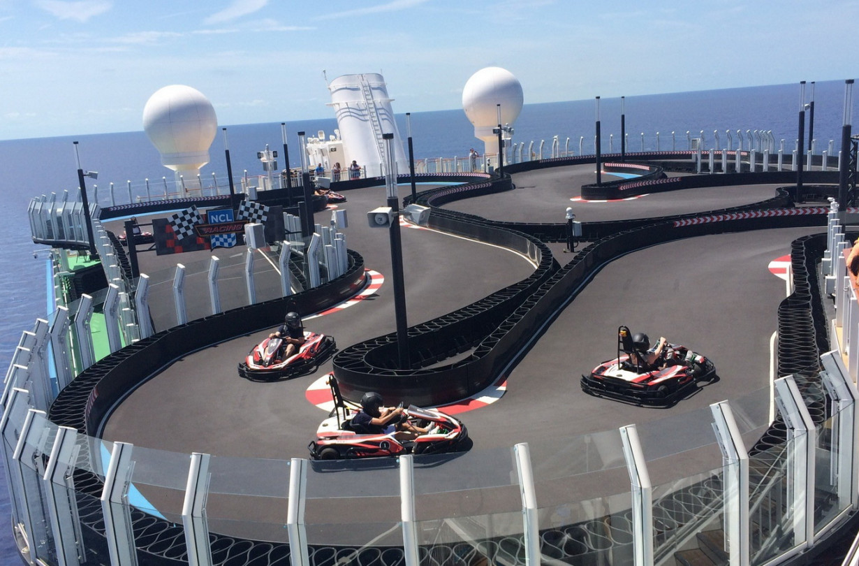 Δεν είναι το πρώτο πλοίο με πίστα καρτ, αφού το «αδελφό» Norwegian Joy το είχε προλάβει από πέρσι. Όμως η πίστα στο Bliss είναι 40% μεγαλύτερη, πολύ πιο κοντά στο κανονικό. Και βέβαια προσφέρει μια πολύ πιο ενδιαφέρουσα εναλλακτική από το να ψήνεσαι στον ήλιο πάνω σε μια ξαπλώστρα.