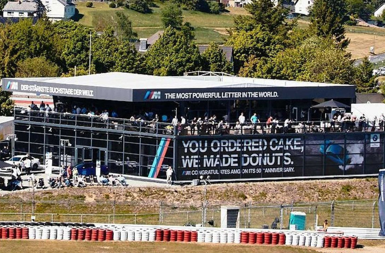 Το πείραγμα για την παλαιότητα της Mercedes-Benz και τα 30 παραπάνω χρόνια στη βιομηχανία, δεν το άφησε η BMW M να «πέσει κάτω». Φέτος λοιπόν που η Mercedes-AMG κλείνει 50 χρόνια ζωής και δραστηριότητας, το M-Division στόλισε το χώρο του στο Nürburgring με μια τεράστια εικόνα που λέει « Παραγγείλατε τούρτα, εμείς φτιάξαμε donuts. H Μ συγχαίρει τη Mercedes-AMG για την πεντηκοστή επέτειό της», δείχνοντας παράλληλα και μια M2 να καίει μπόλικο λάστιχο κάνοντας donuts.