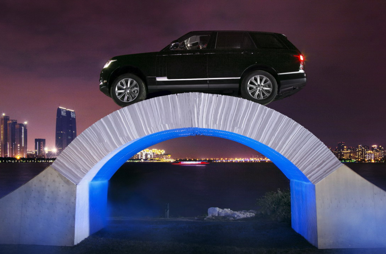 Η Jaguar Land Rover γιόρτασε τα εγκαίνια της έκθεσης της Guangzhou, στην Κίνα, βάζοντας ένα Range Rover των 2.500 kg να περάσει πάνω από μια γέφυρα κατασκευασμένη εξολοκλήρου από χαρτί.