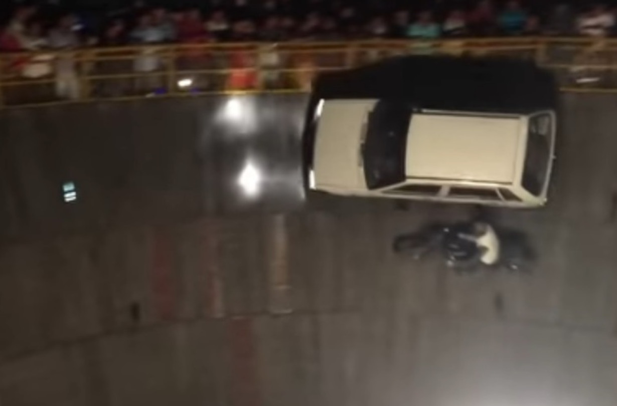 Κι όμως, σ’ αυτό το video που τραβήχτηκε στην Ινδία, ένα Maruti Suzuki 800 καταφέρνει και επιταχύνει, ανεβαίνει στο τοίχωμα και γυρίζει σκαρφαλώνοντας όλο και πιο ψηλά, μέχρι που φτάνει στην κορυφή. Τότε, ένας από τους δύο μοτοσικλετιστές που γυρίζουν μαζί του κατεβαίνει πιο κάτω από το Suzuki και βάζει το χέρι του στη σκεπή του αυτοκινήτου. Εντυπωσιακό και συνάμα τρομακτικό. Α, κι αν προσέξετε, λίγο πιο πριν ο οδηγός του Suzuki έχει την πόρτα ανοιχτή! Όσο για τους μοτοσικλετιστές, δεν έχουν καμία προστασία, αφού δεν φορούν κράνος και είναι ντυμένοι με τζιν, φανελάκι κι ένα καπελάκι τζόκεϊ στο κεφάλι.