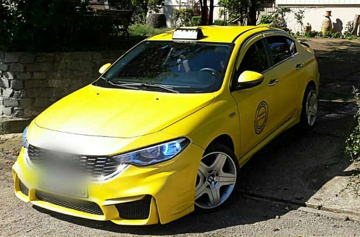 Ένα ταξί Fiat Tipo με προφυλακτήρα από BMW M3