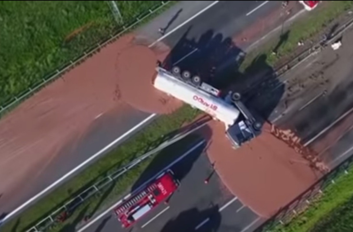 Δεν ξέρουμε πώς έγινε το ατύχημα, όμως το τεράστιο βυτιοφόρο ανατράπηκε, ήρθε κάθετα στο δρόμο και πέρασε το μισό στο αντίθετο ρεύμα, κλείνοντας τρεις από τις τέσσερις λωρίδες του αυτοκινητοδρόμου Α2 Βαρσοβίας-Poznan και χύνοντας στο κατάστρωμα 12 τόνους υγρής σοκολάτας!