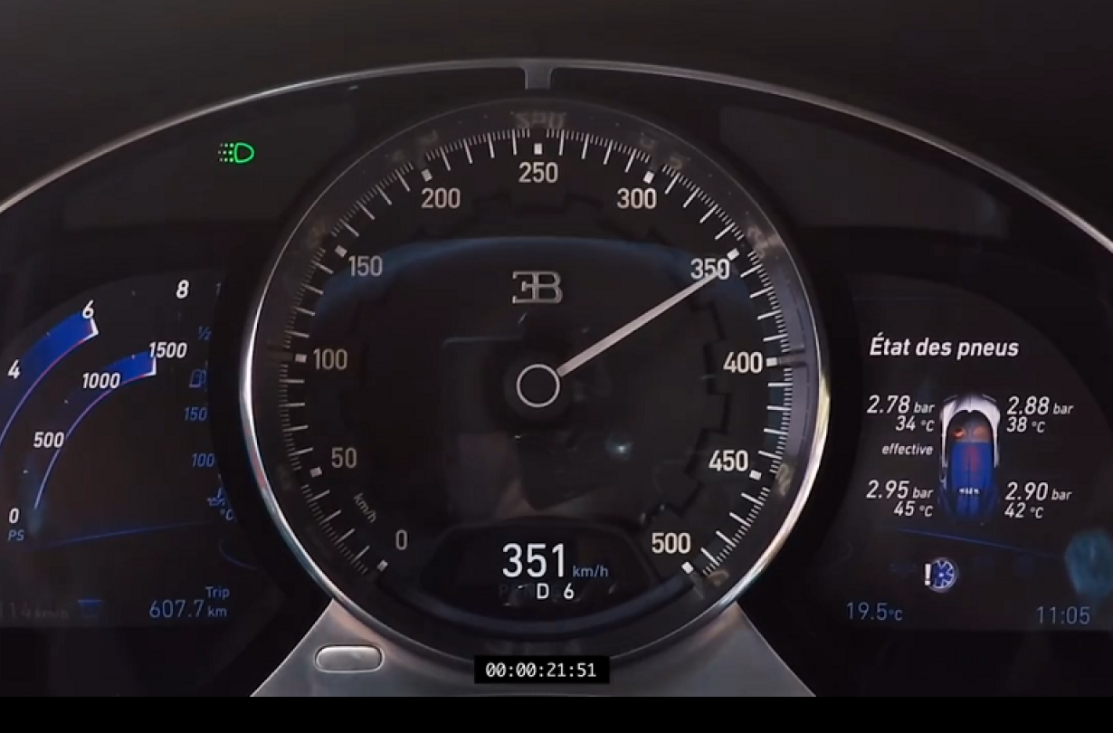 Την ιδέα του μεγέθους της επιτάχυνσης την παίρνουμε από το χρονόμετρο του video, που δείχνει ότι η νέα Bugatti φτάνει από στάση τα 200 km/h σε κάτω από 7,5 δευτερόλεπτα. Κι αυτό, παρά το γεγονός ότι σπίναρε τους τροχούς της σε όλη την 1η ταχύτητα. Με μια πιο συγκρατημένη εκκίνηση, θα πρέπει να ήταν σημαντικά ταχύτερη.