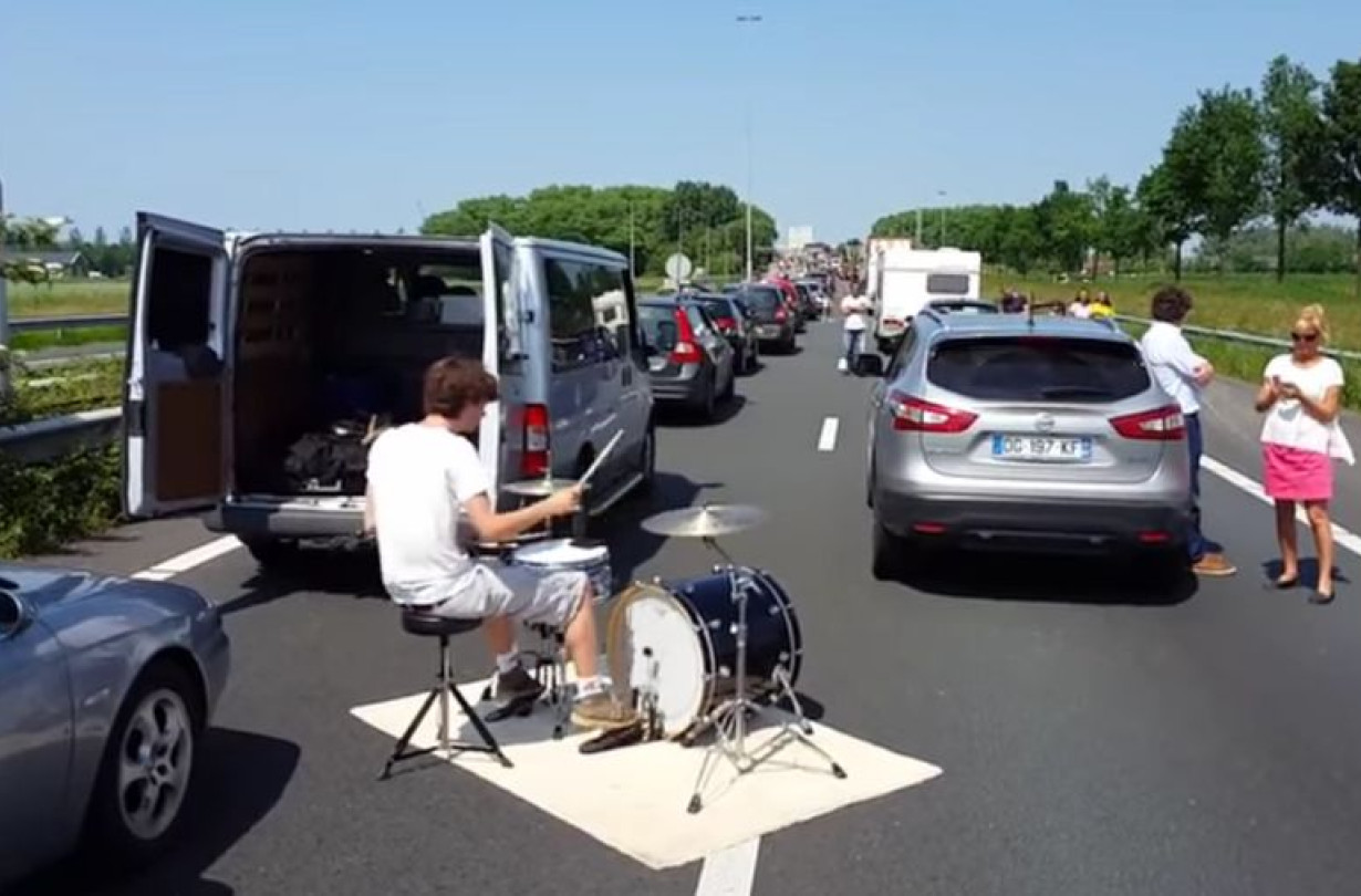 Αυτό συνέβη την περασμένη Κυριακή, 5 Ιουνίου, λίγο έξω από το Eindhoven, στην Ολλανδία. Λόγω ενός ατυχήματος στον αυτοκινητόδρομο Α27 τα αυτοκίνητα παρέμειναν ακινητοποιημένα για πολλές ώρες, σχηματίζοντας μια ουρά χιλιομέτρων. Μεταξύ των άτυχων οδηγών όμως ήταν και ο Adriaan Stoop, ο ντράμερ του ολλανδικού συγκροτήματος The Moods. Και στο πίσω μέρος του Ford Transit που οδηγούσε είχε τα drums του. Γιατί λοιπόν να πάει χαμένη η ευκαιρία για λίγη εξάσκηση;
